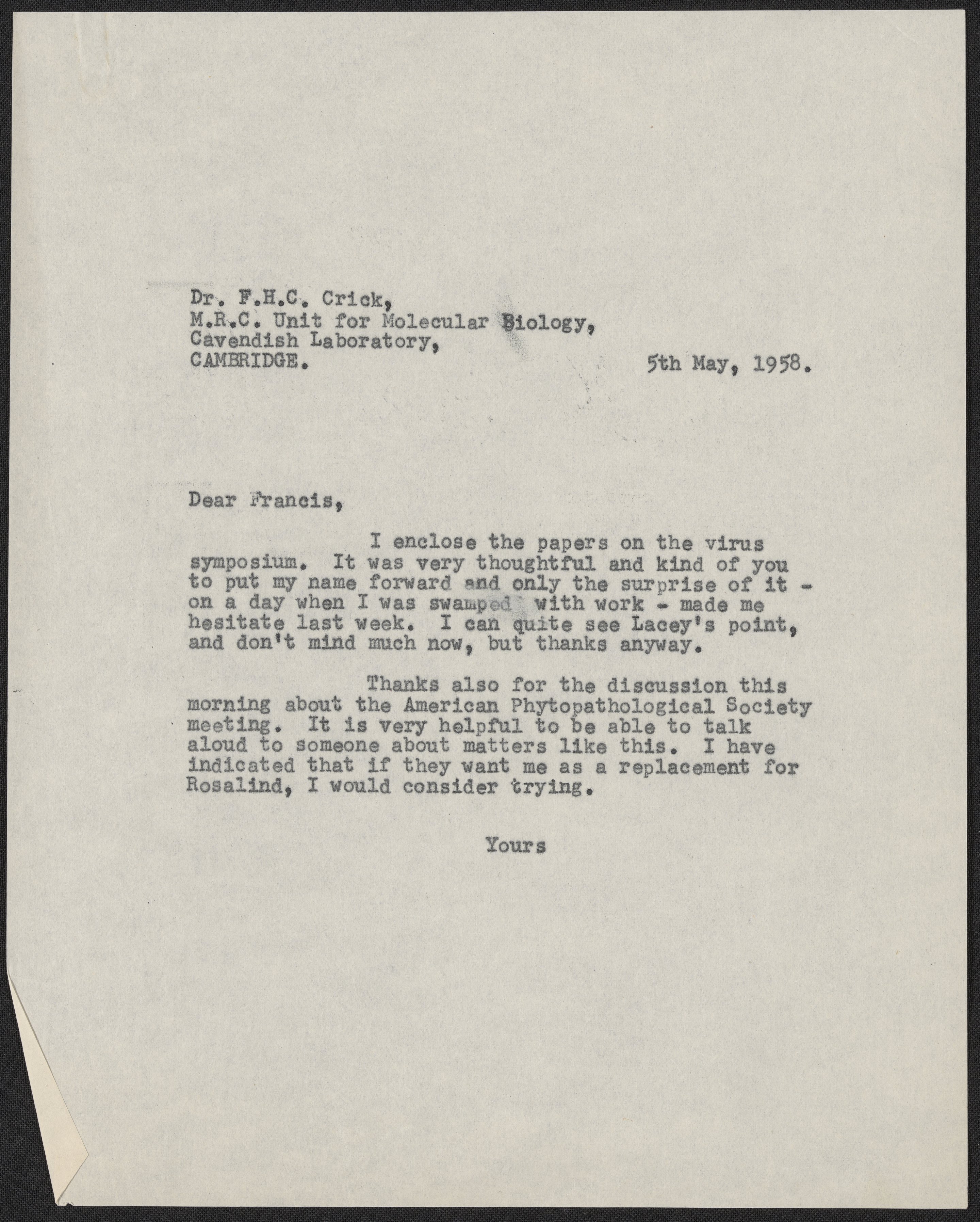 Klug, A. (Aaron), Sir. “Letter from Aaron Klug to Francis Crick, May 5, 1958,” May 5, 1958. History of Molecular Biology Collection, Box 19, Folder 17. Science History Institute. Philadelphia. https://digital.sciencehistory.org/works/h1qsz71.