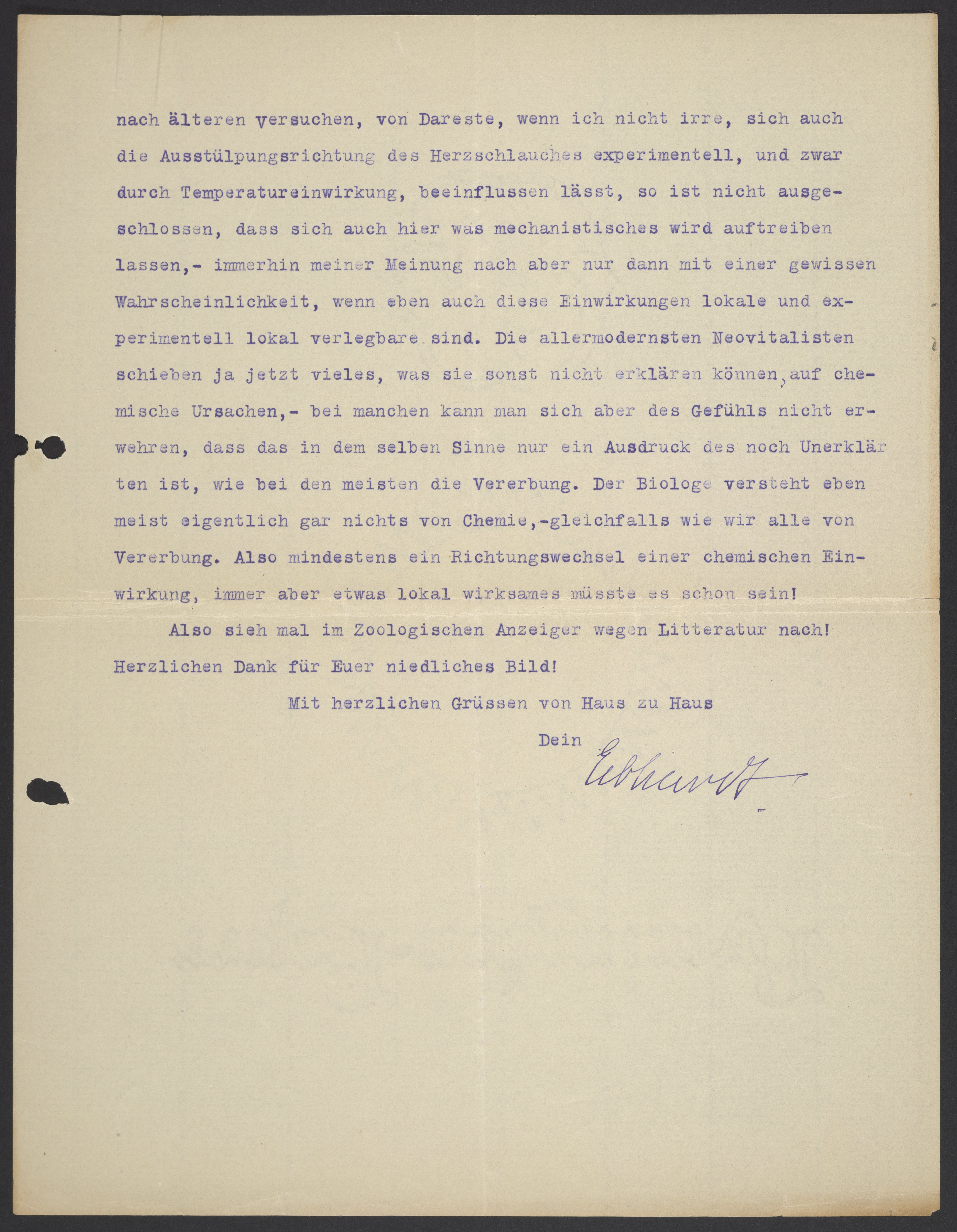 nach älteren Versuchen, von Dareste, wenn ich nicht irre, sich auch die Ausstülpungrichtung des Herzschlauches experimentell, und zwar durch Temperatureinwirkung, beeinflussen lässt, so ist nicht ausgeschlossen, dass sich auch hier was mechanistisches wird auftreiben lassen, - immerhin meiner Meinung nach aber nur dann mit einer gewissen Wahrscheinlichkeit, wenn eben auch diese Einwirkungen lokale und experimentell lokal verlegbare sind. Die allermodernsten Neovitalisten schieben ja jetzt vieles, was sie sonst nicht erklären können, auf chemische Ursachen, - bei machen kann man sich aber des Gefühls nicht erwehren, dass das in dem selben Sinne nur ein Ausdruck des noch Unerklärten ist, wie bei den meisten die Vererbung. Also mindestens ein Richtungswechsel einer chemischen Einwirkung, immer aber etwas lokal wirksames müsste es schon sein!