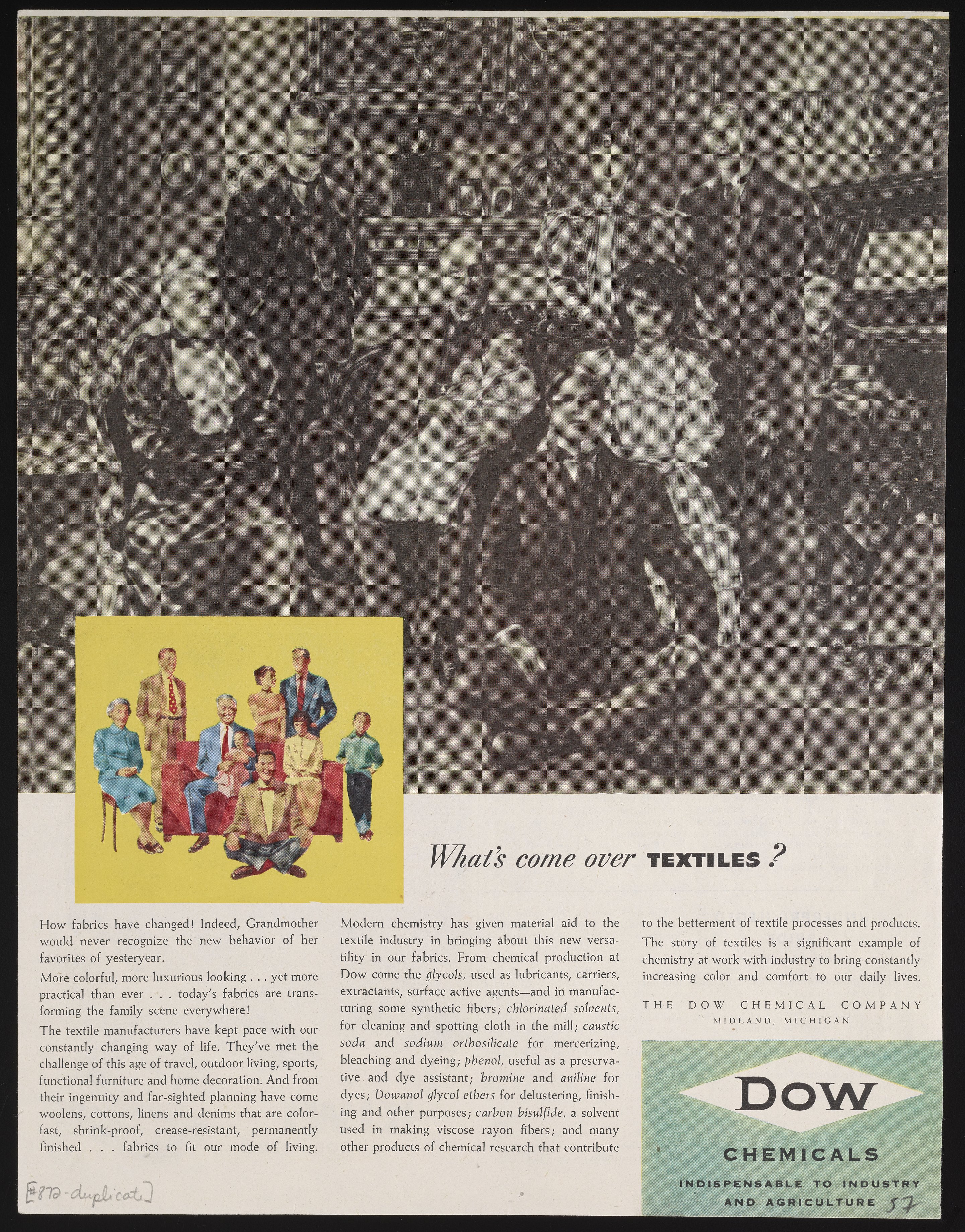 Dow Chemical Company. “What's Come Over Textiles?,” circa 1951. Advertisements from the Dow Chemical Historical Collection, Box 9. Science History Institute. Philadelphia. https://digital.sciencehistory.org/works/h3dx5kv.