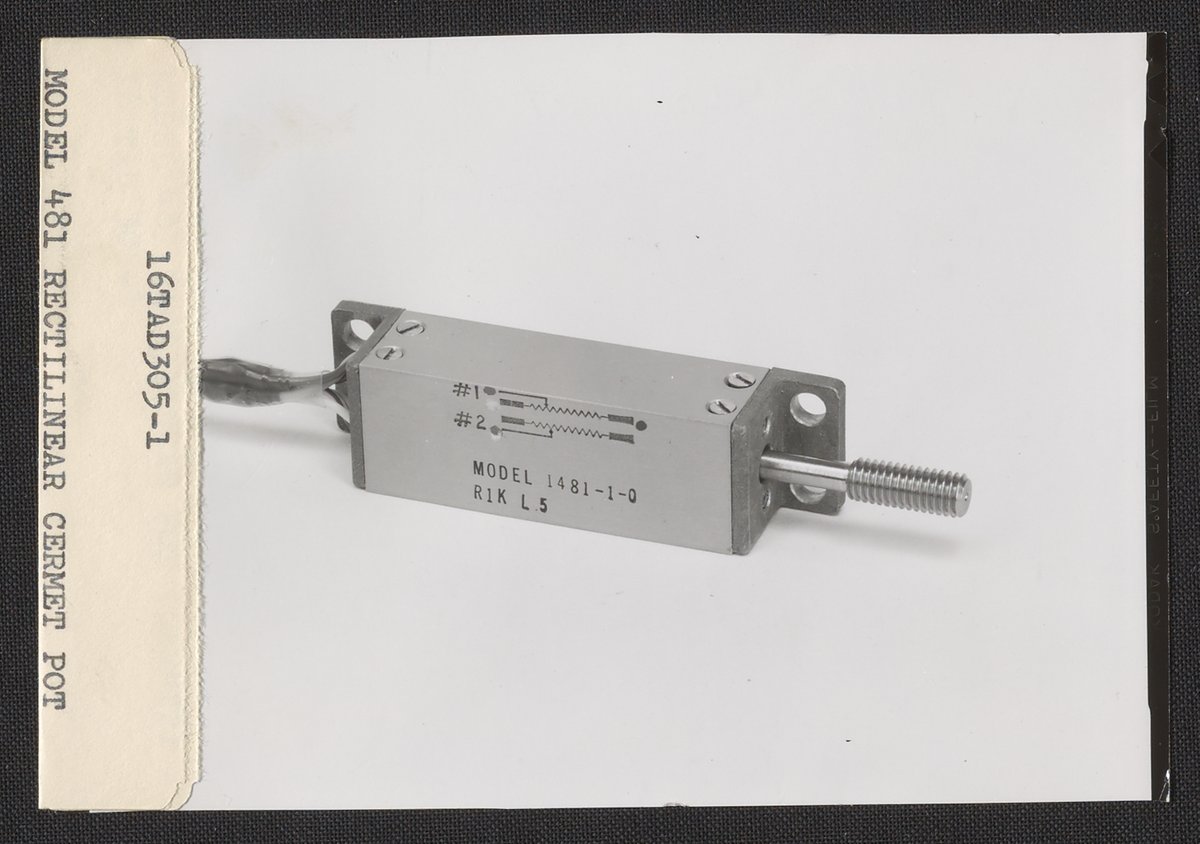Dietrich, T. A. “Beckman Model 481 Rectilinear Cermet Potentiometer,” 1950–1969. Beckman Historical Collection, Box 86. Science History Institute. Philadelphia. https://digital.sciencehistory.org/works/h415pb02n.
