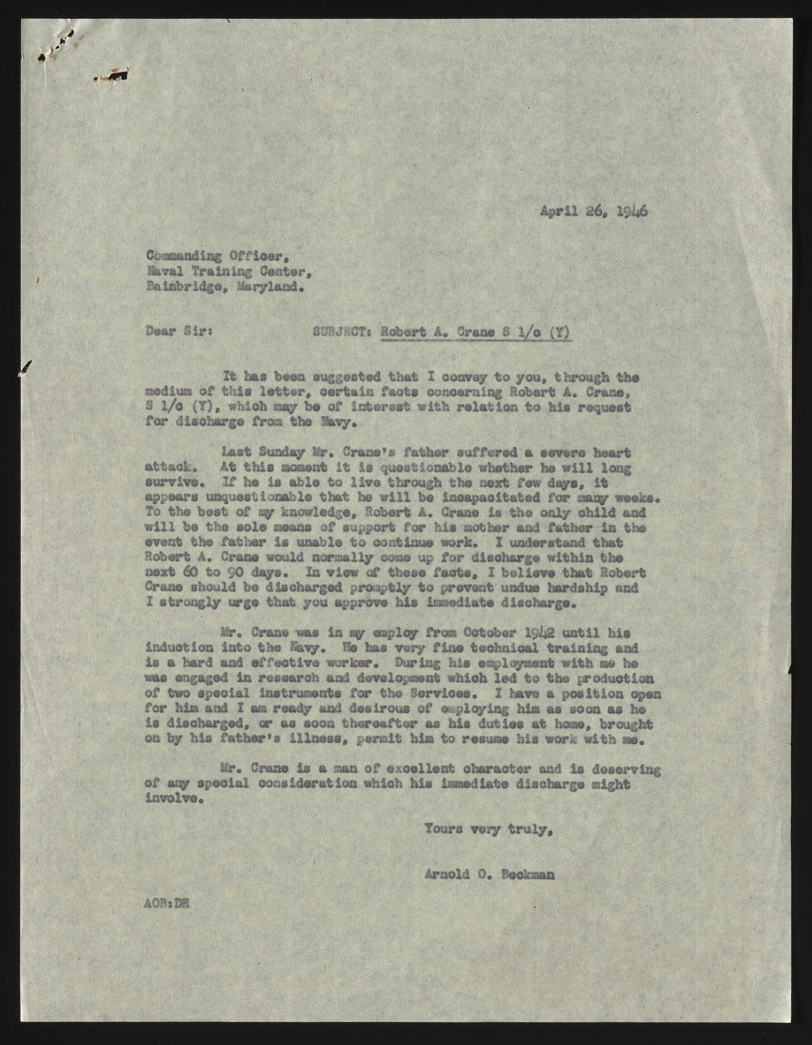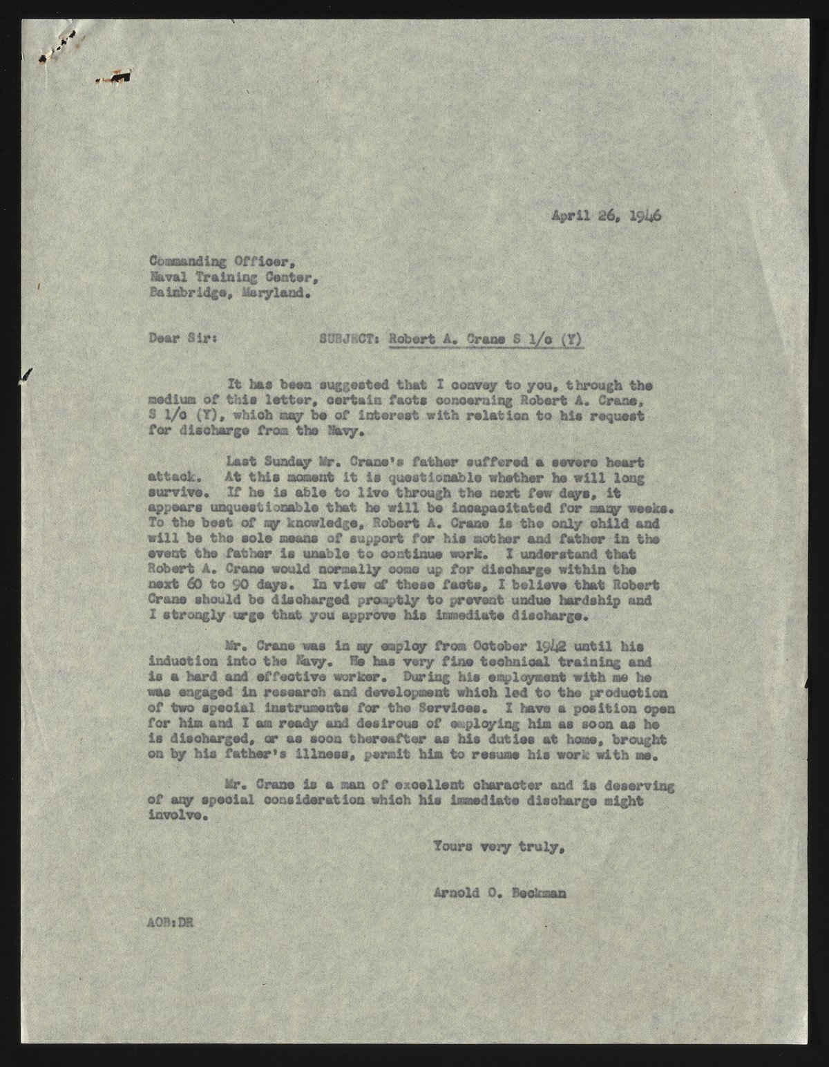 Letter from Arnold O. Beckman to Commanding Officer, Naval Training Center