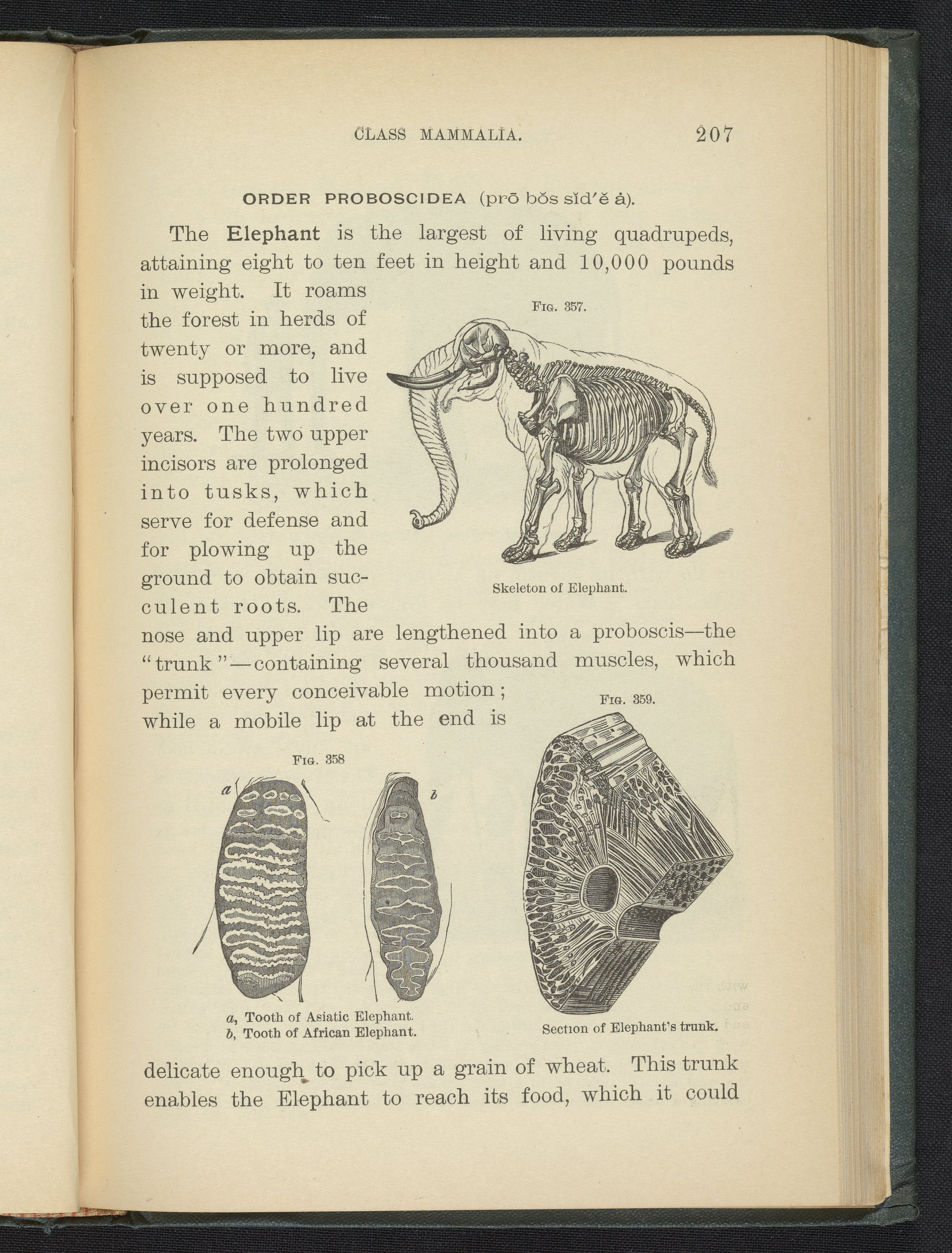 Figure 357. Skeleton of Elephant. Figure 358. Elephant Teeth. Figure 359. Section of Elephant's Trunk