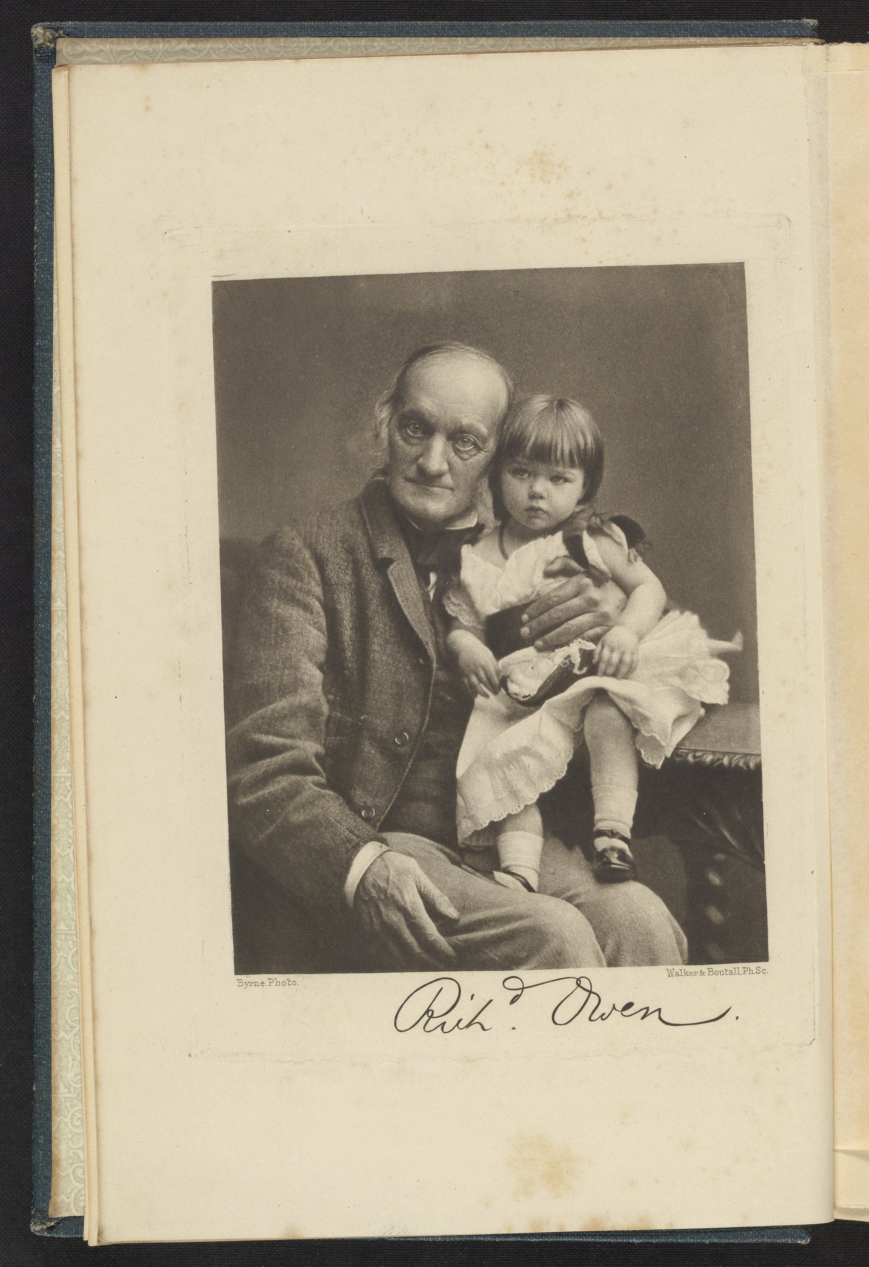 Photographic portrait print of English biologist, comparative anatomist and paleontologist Richard Owen (1804-1892) with his granddaughter. Owen published extensively on fossils and is famously known for coining the word Dinosauria.