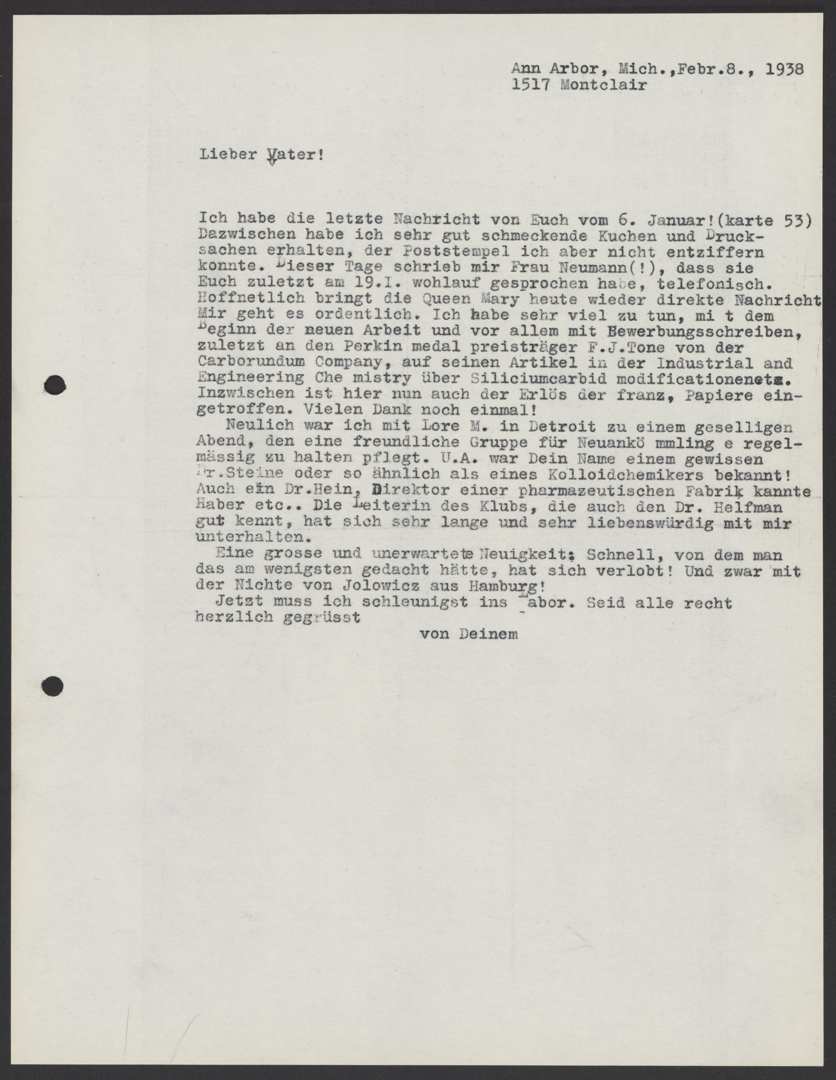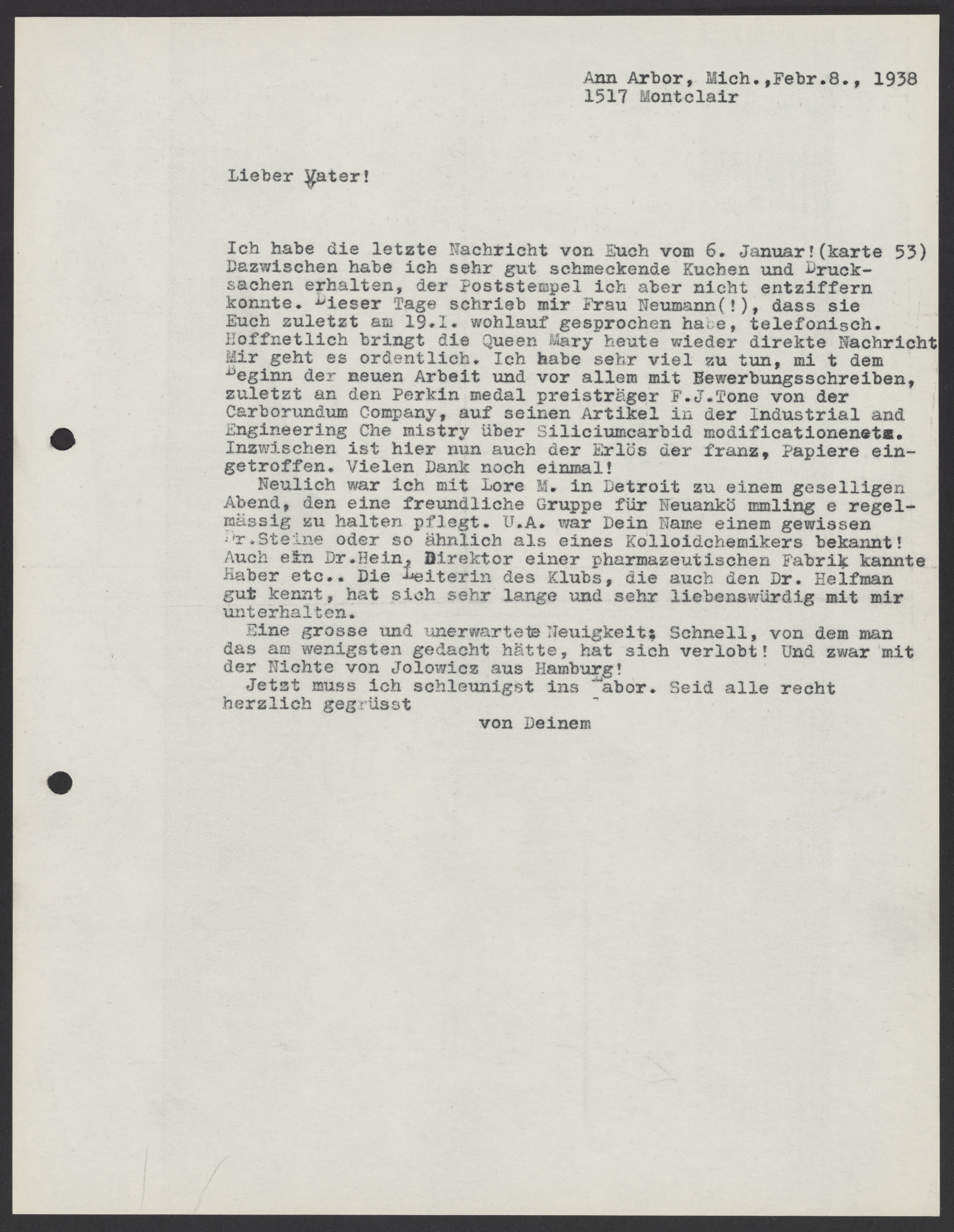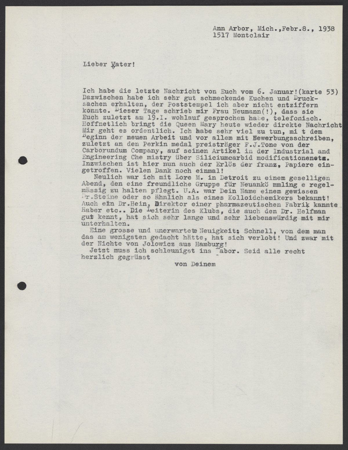 I received your last message on January 6th (card 53). Around the same time, I received the delicious cakes and papers, but I couldn't decipher the postmark. Mrs. Neumann wrote to me recently that she last spoke to you all on January 19th by phone. I hope the Queen Mary will bring recent news again today. I'm doing well. I have a lot to do at my new job and am busy writing letters of application, most recently to the Perkin Medal Prize winner F.J. Tone of the Carborundum Company in response to his article in Industrial and Engineering Chemistry on the silicon carbide modification network. In the meantime, confirmation of the auction proceeds has arrived. Many thanks again!