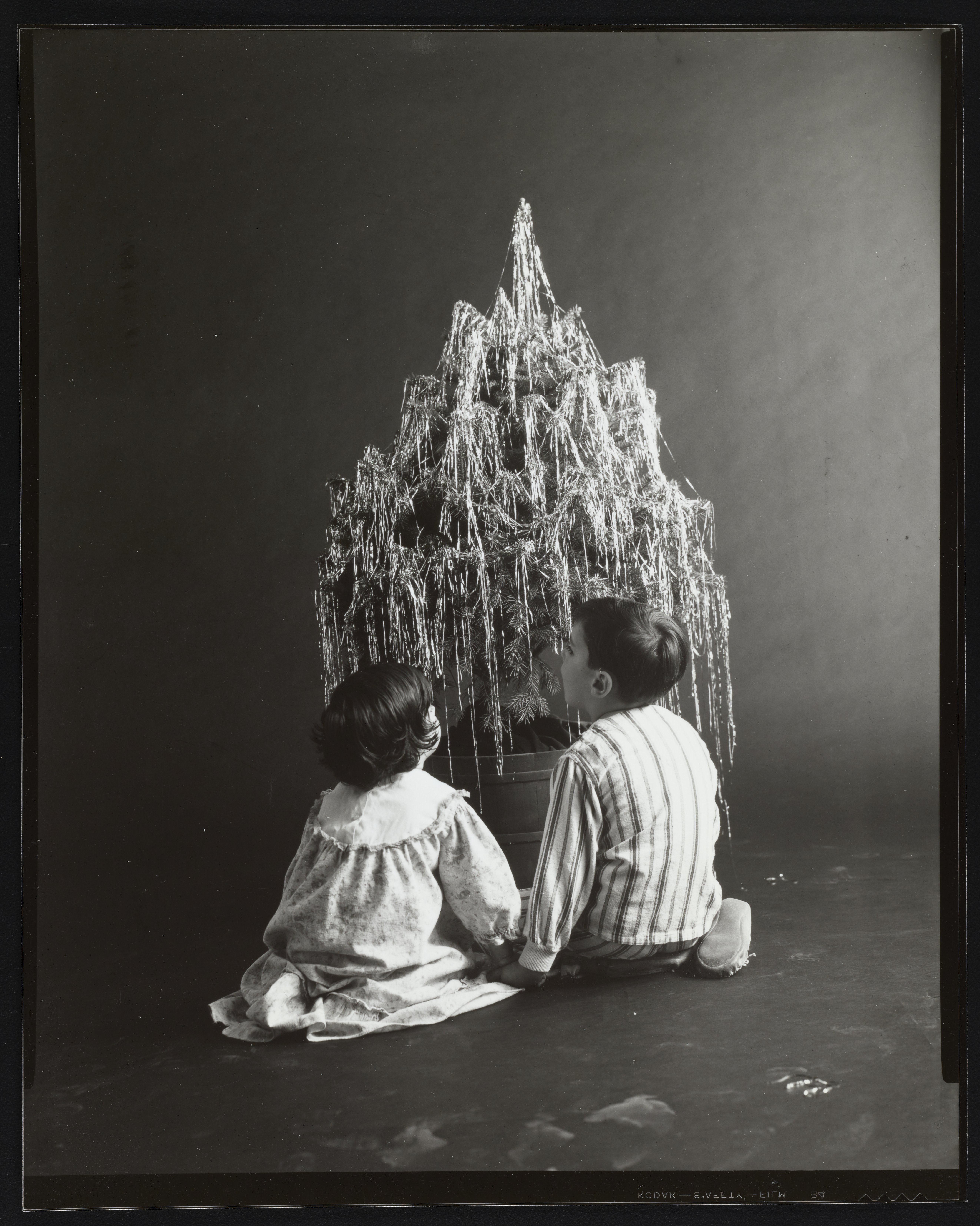 General view of two children seated in front of a Christmas tree decorated with icicles made from saran plastic. Initially developed for the U.S. Army to wrap arms and equipment for transport during World War II, saran plastic was subsequently developed and marketed as Saran Wrap for household use, as well as a range of other consumer applications.