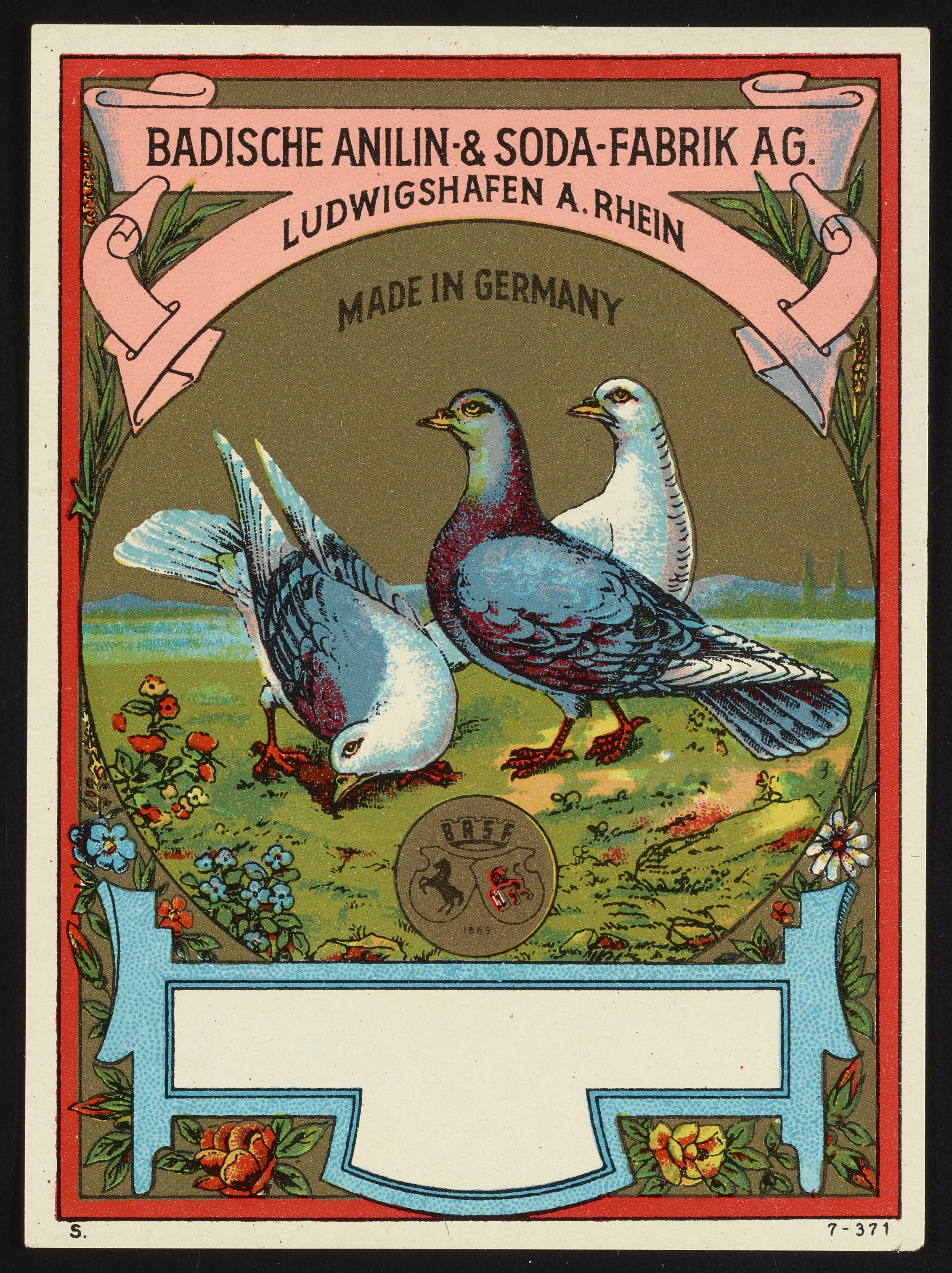 “Badische Anilin & Soda-Fabrik Dye Label with Pigeons.” Dye transfer prints. Ludwigshafen am Rhein, Germany: Badische Anilin- & Soda-Fabrik, circa 1900. Science History Institute. Philadelphia. https://digital.sciencehistory.org/works/h702q750j.
