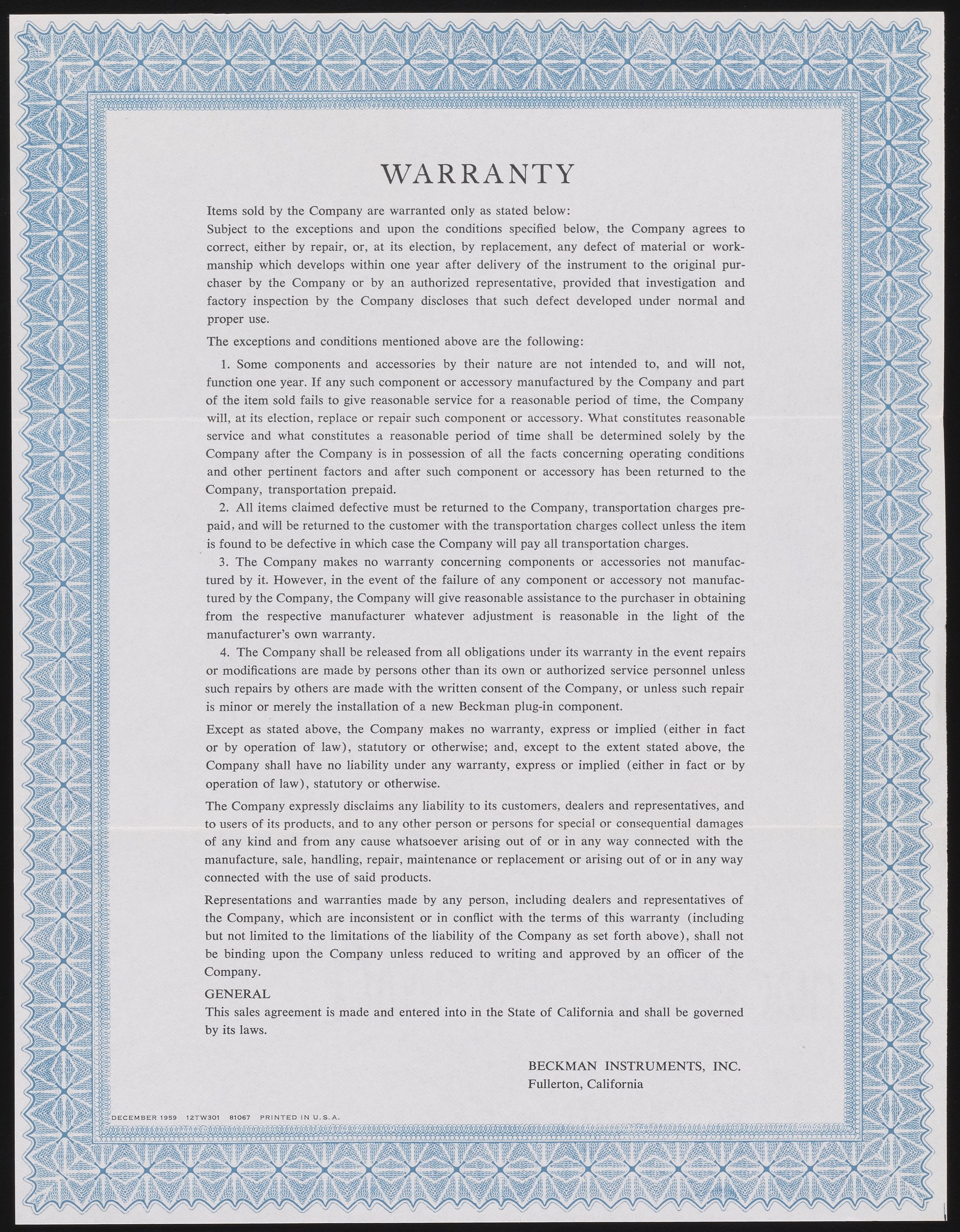 Beckman Instruments, Inc. “Beckman Glucose Analyzer Warranty.” Fullerton, California, 1959. Beckman Historical Collection, Box 17, Folder 29. Science History Institute. Philadelphia. https://digital.sciencehistory.org/works/h989r325g.