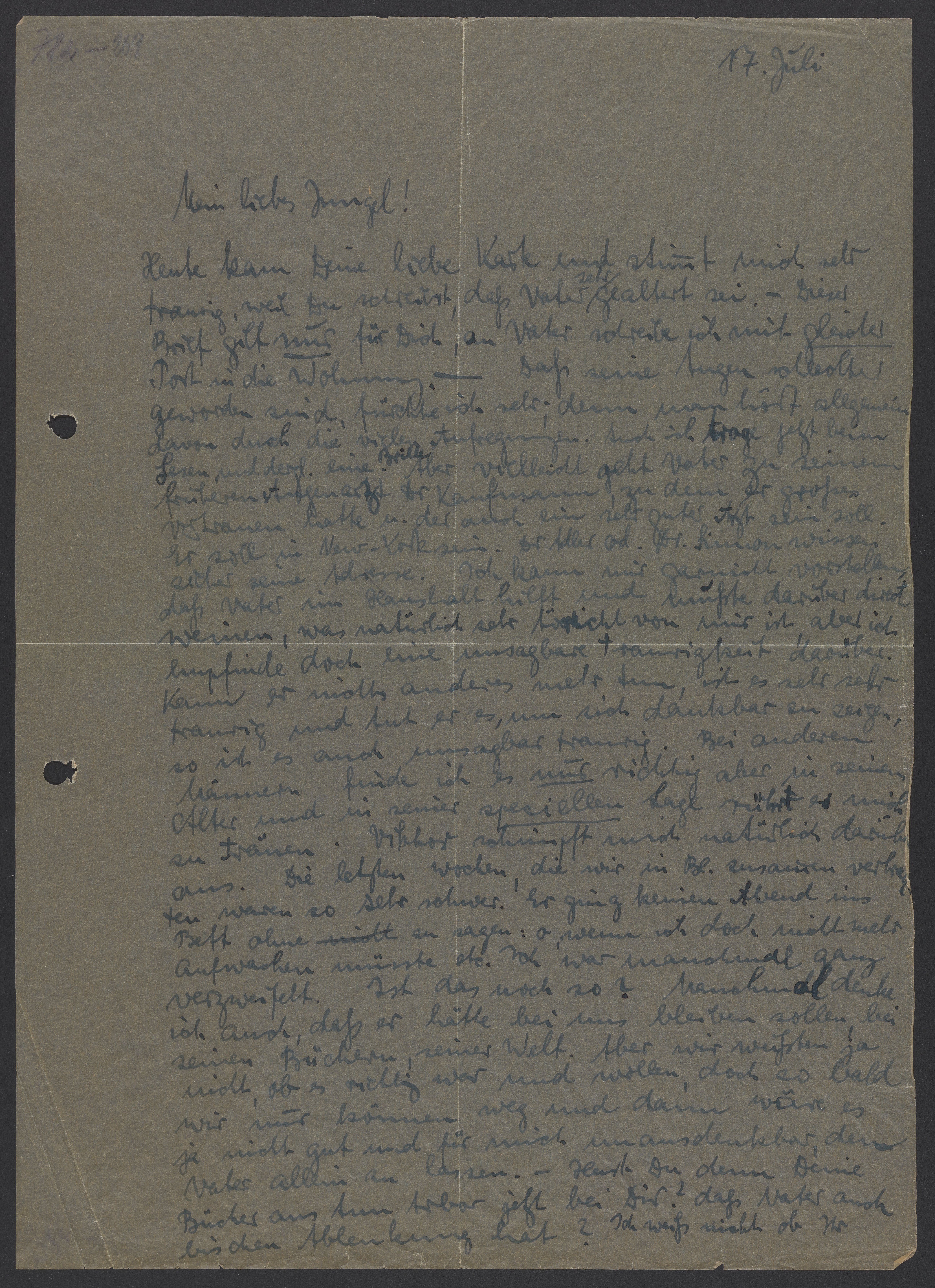 Heute kam deine liebe Karte und stimmt mich sehr traurig, weil Du schreibst, dass Vater sehr gealtert sei. – Dieser Brief gilt nur für Dich, an Vater schreibe ich mit gleicher Post in die Wohnung. – Daß seine Augen schlechter geworden sind, fürchte ich sehr; denn man hört allgemein davor durch die viele Aufregungen. Auch ich trage jetzt beim Lesen, und dergl. Eine Brille. Aber vielleicht geht Vater zu seinen früheren Augenarzt Dr. Kaufmann, zu dem er großes Ansehen hatte u. der auch ein sehr guter Arzt sein soll. Er soll in New York sein. Dr. Adler od. Dr. Simon wißen sicher seine Adresse. Ich kann mir garnicht vorstellen, dass Vater im Haushalt hilft und müßte daruber direct weinen, was natürlich sehr töricht von mir ist, aber ich empfinde doch eine unsagbare Traurigkeit darüber. Kann er nichts anderes mehr tun, ist es sehr sehr traurig und tut er es, um sich dankbar zu zegien, so ist es auch unsagbar traurig. Bei anderen Männern finde ich es nur richtig aber in seinem Alter und in seiner speciellen Lage rührt es mich zu Tränen. Viktor schimpft mich darüber natürlich darüber aus. Die letzten Wochen, die wir in Bl. Zusammen verbrachten, waren so sehr schwer. Er ging keinen Abend ins Bett ohne zu sagen: O, wenn ich doch nicht mehr aufwachen müßte etc. Ich war manchmal ganz verzweifelt. Ist das noch so? Manchmal denke ich auch, dass er hätte bei uns bleiben sollen, bei seinen Büchern, seiner Welt. Aber wir wußten ja nicht, ob es richtig war und wollen, doch so bald wir nur können, weg und dann wäre es ja nicht gut und für mich unausdenkabr, den Vater allein zu lassen. – Hast Du denn Deine Bücher aus Ann Arbor jetzt bei Dir? Daß Vater auch bischen Ablenkung hat? Ich weiß nicht ob Ihr