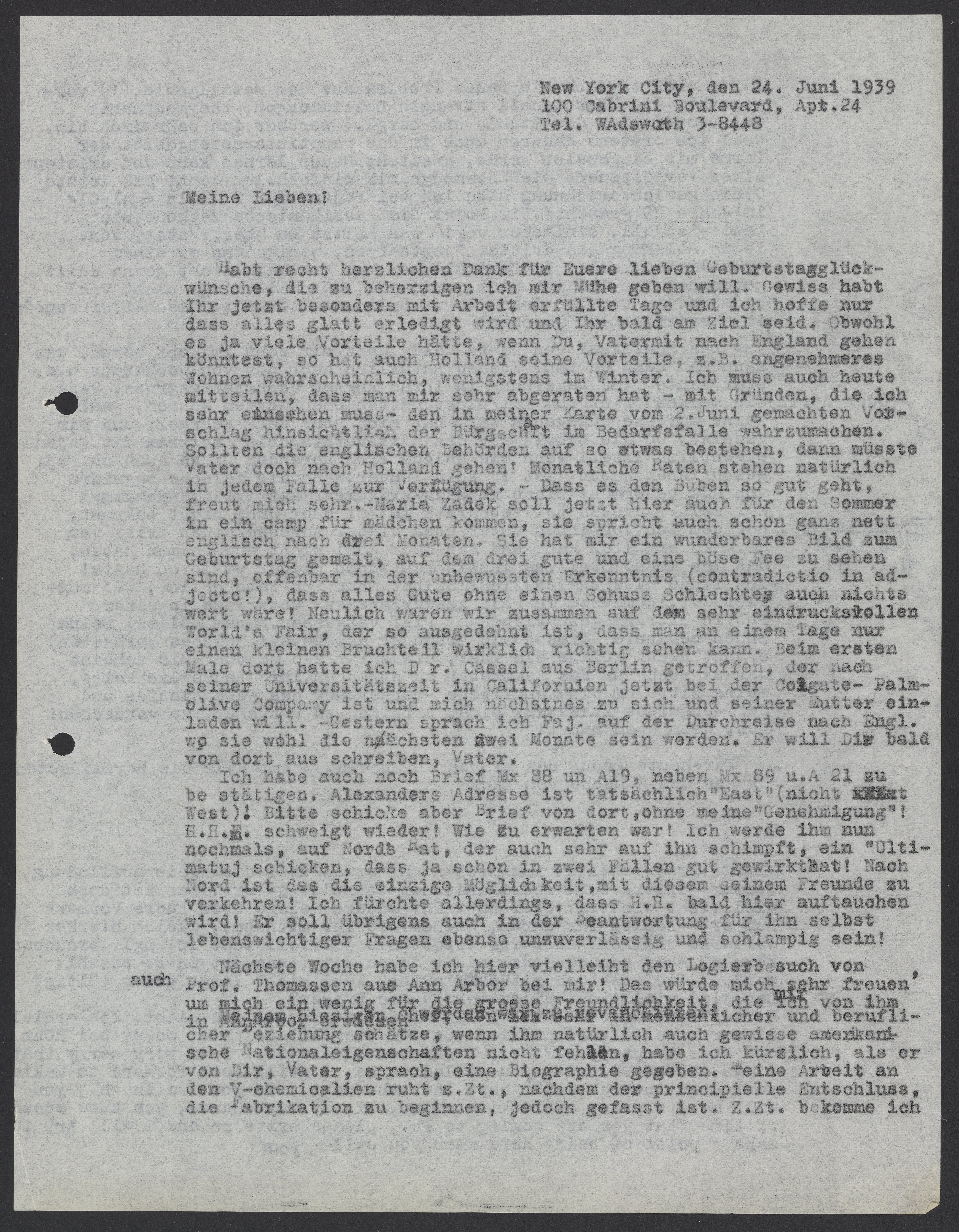 Habt recht herzlichen Dank für Euere lieben Geburtstagglückwünsche, die zu beherzigen ich mir Mühe geben will. Gewiss habt Ihr jetzt besonders mit Arbeit erfüllte Tage und ich hoffe nur dass alles glatt erledigt wird und Ihr bald am Ziel seid. Obwohl es ja viele Vorteile hätte, wenn Du, Vater, mit nach England gehen könntest, so hat auch Holland seine Vorteile, z.B. angenehmeres Wohnen wahrscheinlich, wenigstens im Winter. Ich muss auch heute mitteilen, dass man mir sehr abgeraten hat - mit Gründen, die ich sehr einsehen muss- den in meiner Karte vom 2. Juni gemachten Vorschlag hinsichtlich der Bürgschaft im Bedarfsfalle wahrzumachen. Sollten die englischen Behörden auf so etwas bestehen, dann müsste Vater doch nach Holland gehen! Monatliche Raten stehen natürlich in jedem Falle zur Verfügung. - Dass es den Buben so gut geht, freut mich sehr.-Maria Zadek soll jetzt hier auch für den Sommer in ein Camp für Mädchen kommen, sie spricht auch schon ganz nett englisch nach drei Monaten. Sie hat mir ein wunderbares Bild zum Geburtstag gemalt, auf dem drei gute und eine böse Fee zu sehen sind, offenbar in der unbewussten Erkenntnis, (contradictio in adjecto!), dass alles Gute ohne einen Schuss Schlechter auch nichts wert wäre! Neulich waren wir zusamman auf dem sehr eindruckstollen World's Fair, der so ausgedehnt ist, dass man an einem Tage nur einen kleinen Bruchteil wirklich richtig sehen kann. Beim ersten Male dort hatte ich Dr. Cassel aus Berlin getroffen, der nach seiner Universitätszeit in Californien jetzt bei der Colgate-Palm-Olive Company ist und mich nächstens zu sich und seiner Mutter einladen will. -Gestern sprach ich Faj. auf der Durchreise nach Engl. wo sie wohl die nächsten zwei Monate sein werden. Er will Dir von dort aus schreiben, Vater.