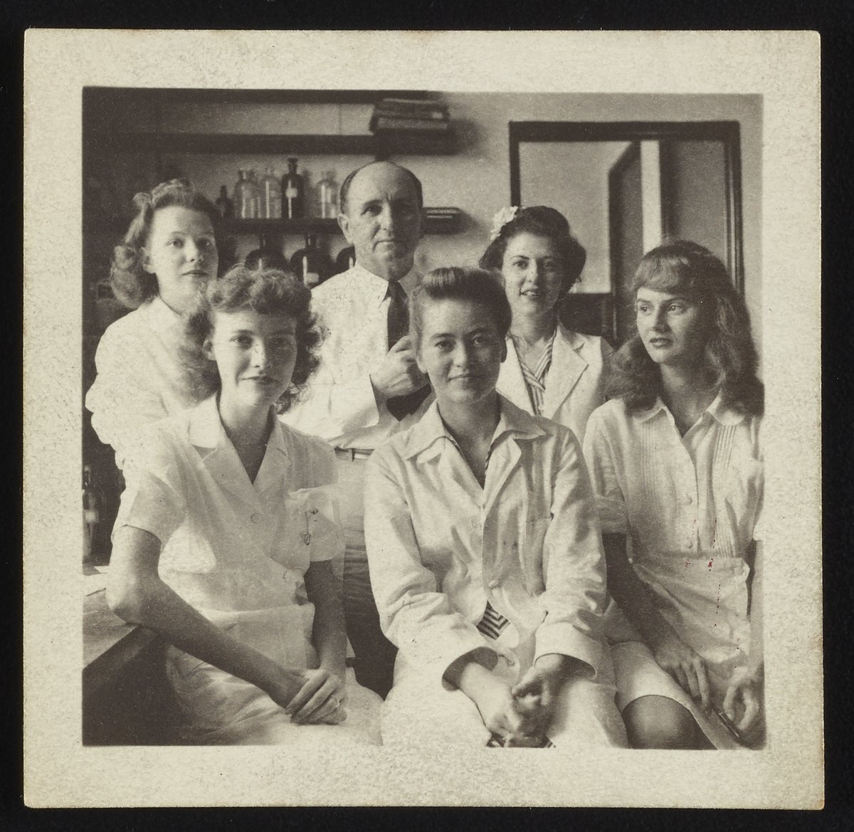 Group portrait with Dr. Michael Somogyi (1883-1971) and Dr. Irene E. Karl (1915-2006) at the Jewish Hospital of St. Louis. Dr. Karl, wearing a lab coat and striped blouse, stands next to Dr. Somogyi on his left-hand side. The remaining women in the photograph are unidentified.