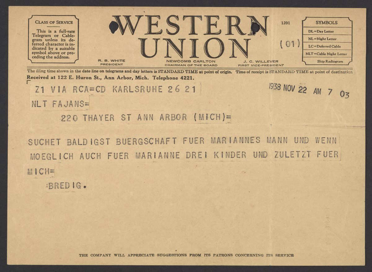 Telegram from Georg Bredig (1868-1944) asking his son Max Bredig (1902-1977) to seek American sponsorship for his family.