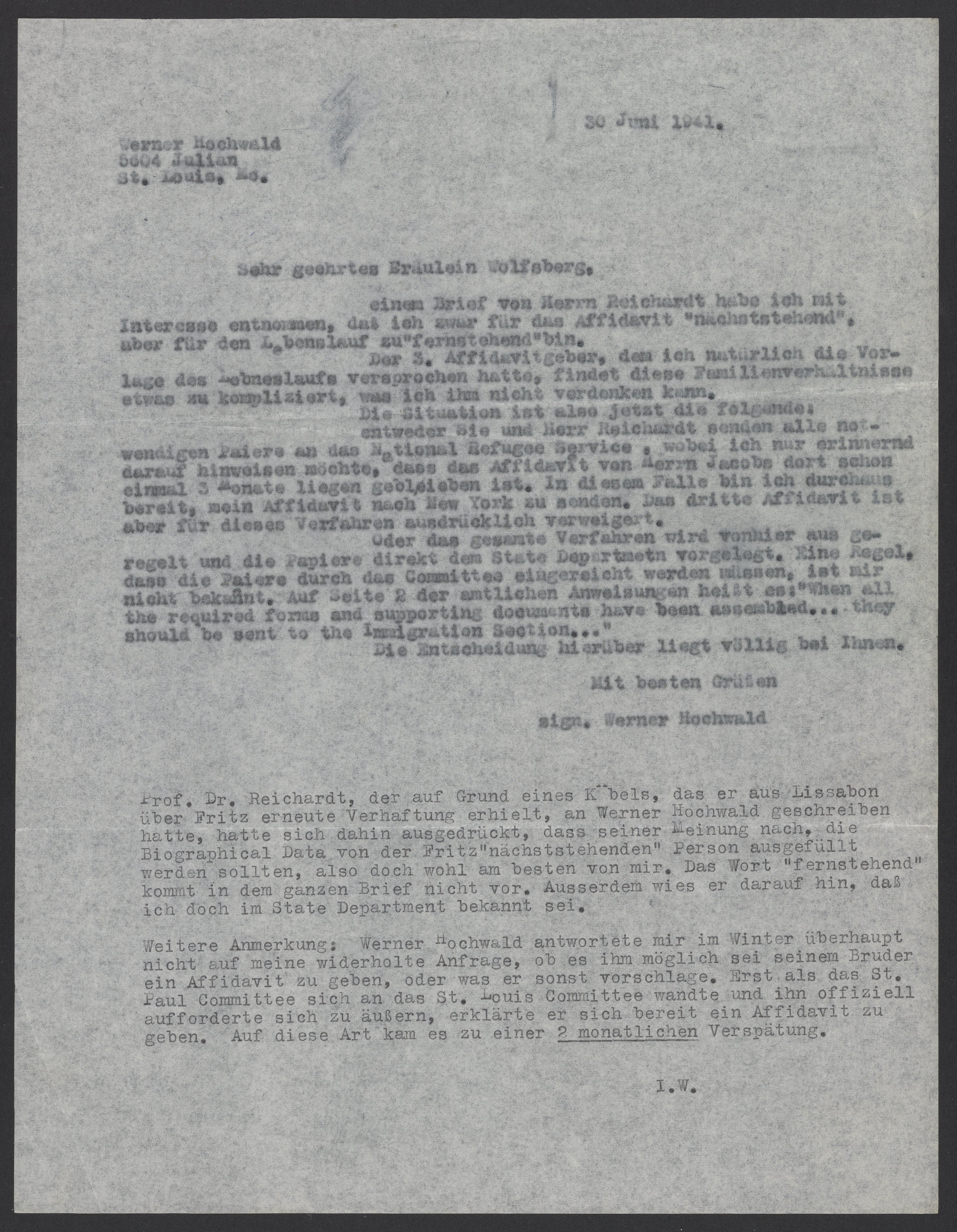 Weitere Anmerkung: Werner Hochwald antwortete mir im Winter überhaupt nicht auf meine wiederholte Anfrage, ob es ihm möglich sei seinem Bruder ein Affidavit zu geben, oder was er sonst vorschlage. Erst als das St. Paul Committee sich an das St. Louis Committee wandte und ihn offiziell aufforderte sich zu äußern, erklärte er sich bereit ein Affidavit zu geben. Auf diese Art kam es zu einer 2 monatlichen Verspätung.