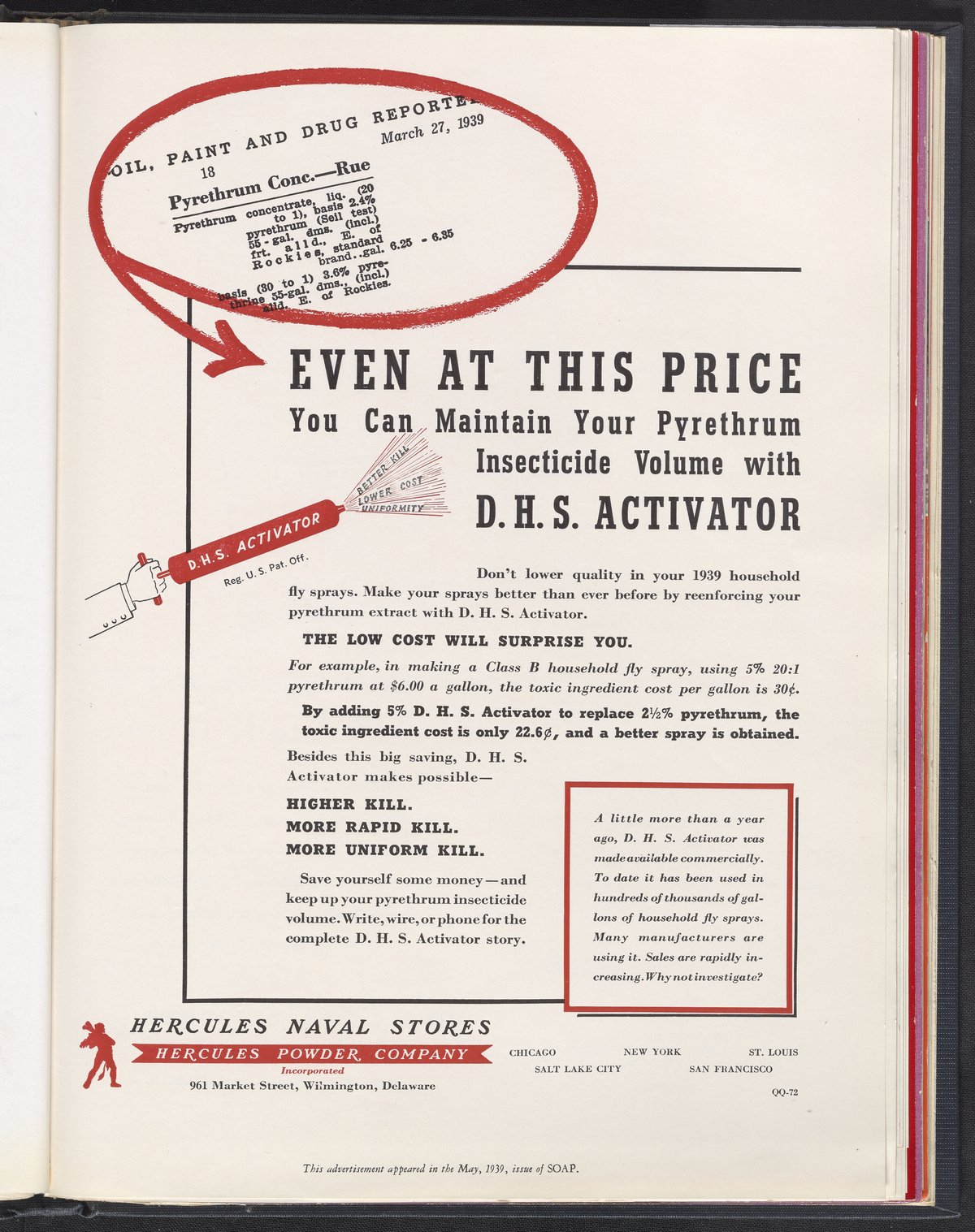 Hercules Incorporated. “Even at This Price You Can Maintain Your Pyrethrum Insecticide Volume with D.H.S. Activator.” 1939 Hercules Advertisements, 1939. Records of Hercules Incorporated, Volume 1939. Science History Institute. Philadelphia. https://digital.sciencehistory.org/works/hm50ts42p.
