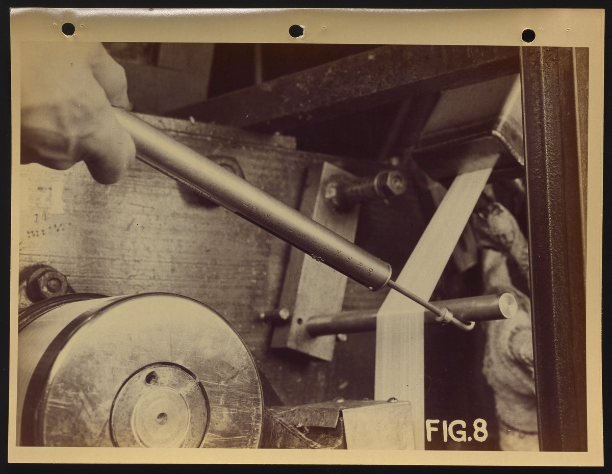 Small JPG1200 x 1542px — 252 KBLarge JPG2880 x 3702px — 1.1 MBFull-sized JPG3644 x 4684px — 1.5 MBOriginal fileTIFF — 3644 x 4684px — 48.9 MBThree close-up views of tension measurements taken on various components of a drawing machine, including the draw, creel, and crimper, used during the early stages of nylon production and research at DuPont. The photographs are labeled "Figure 6, "Figure 7," and "Figure 8," indicating that they were used in a report or publication.