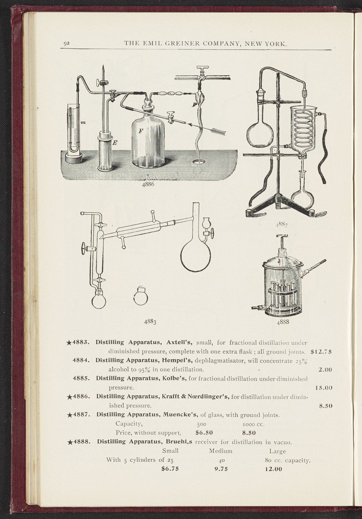 Emil Greiner Company. “Various Distilling Apparatus.” Illustrated Catalogue of Scientific Apparatus, Chemical Glassware, and Laboratory Supplies. New York (State), 1910–1919. https://digital.sciencehistory.org/works/ht24wj43h.