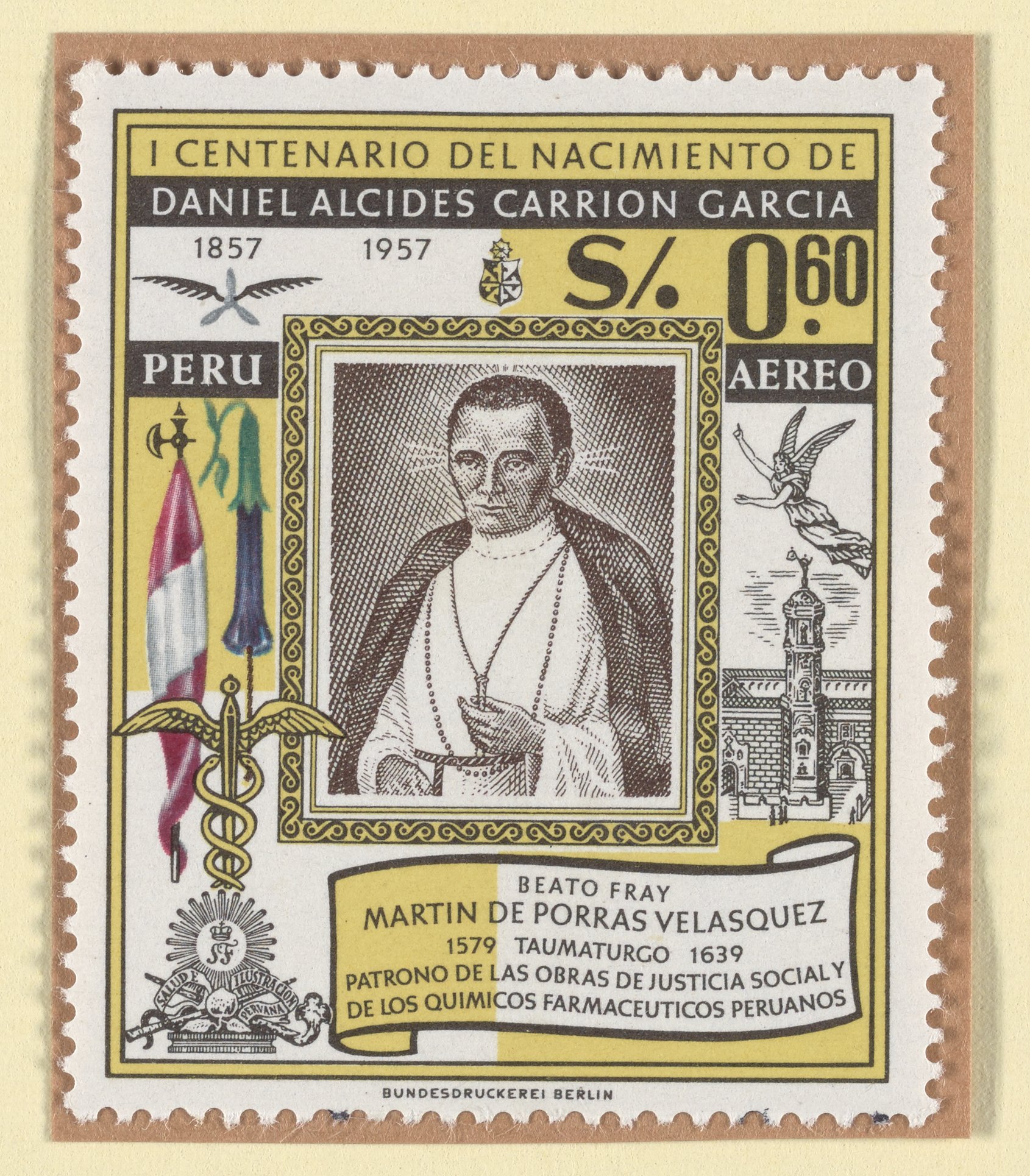 Peruvian postage stamp commemorating the centenary of the birth of Daniel Alcides Carrión García (1857-1885), a Peruvian medical student after whom Carrion's disease is named. The stamp depicts Saint Martin de Porres Velázquez (1579-1639), known as a patron saint of social justice and Peruvian pharmaceutical chemists, as well as for his medical care of the poor.