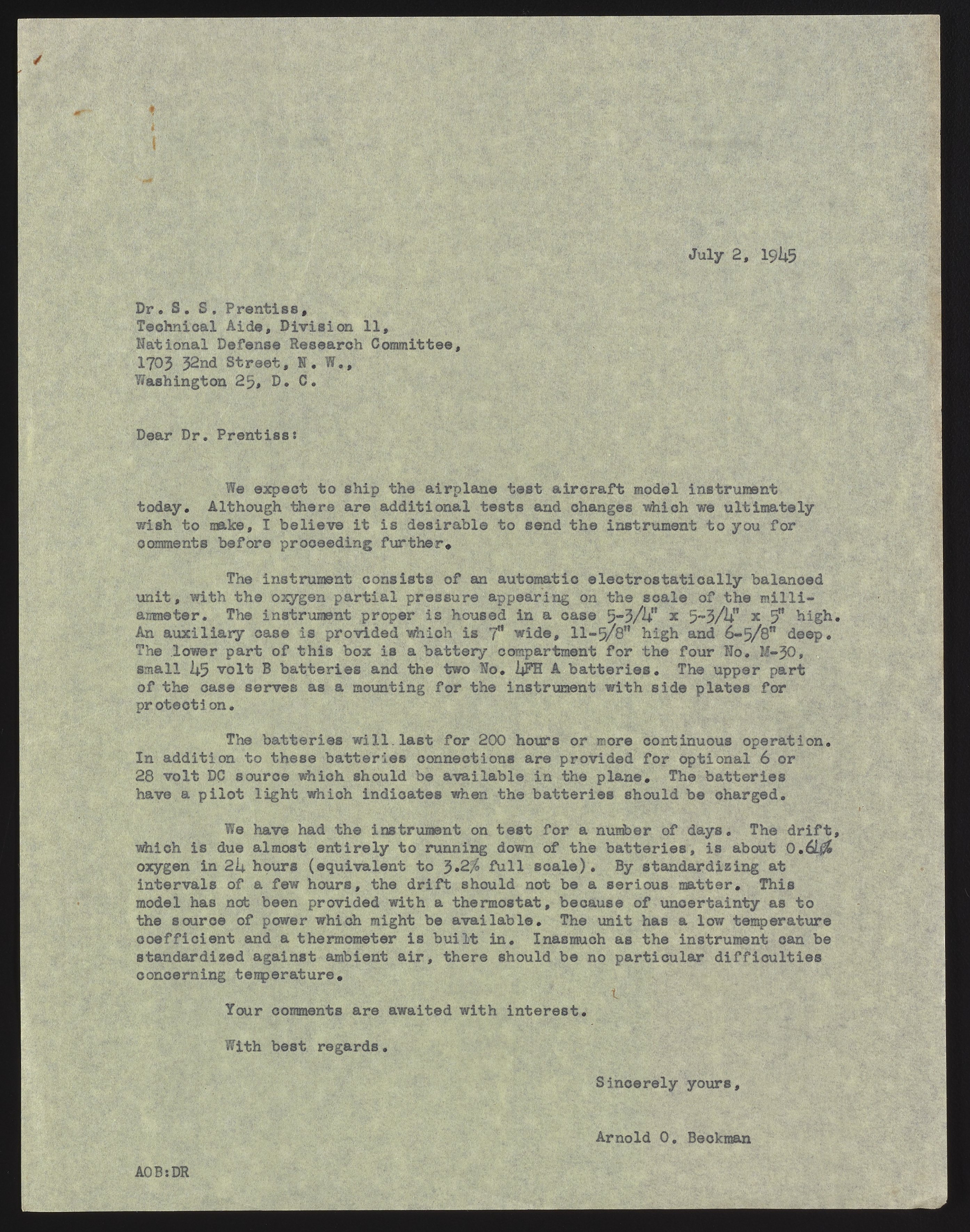 In this letter, Beckman describes the specifications of the aircraft model oxygen meter (the Model L).
