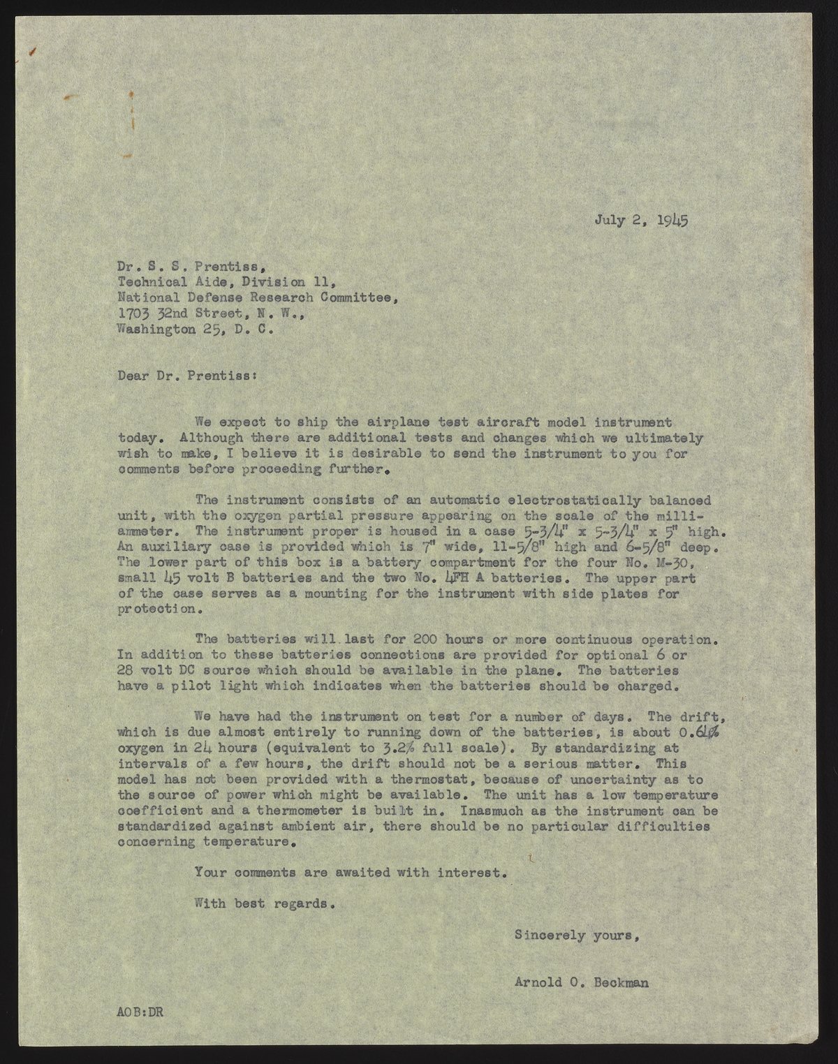 Letter from Arnold O. Beckman to S. S. Prentiss