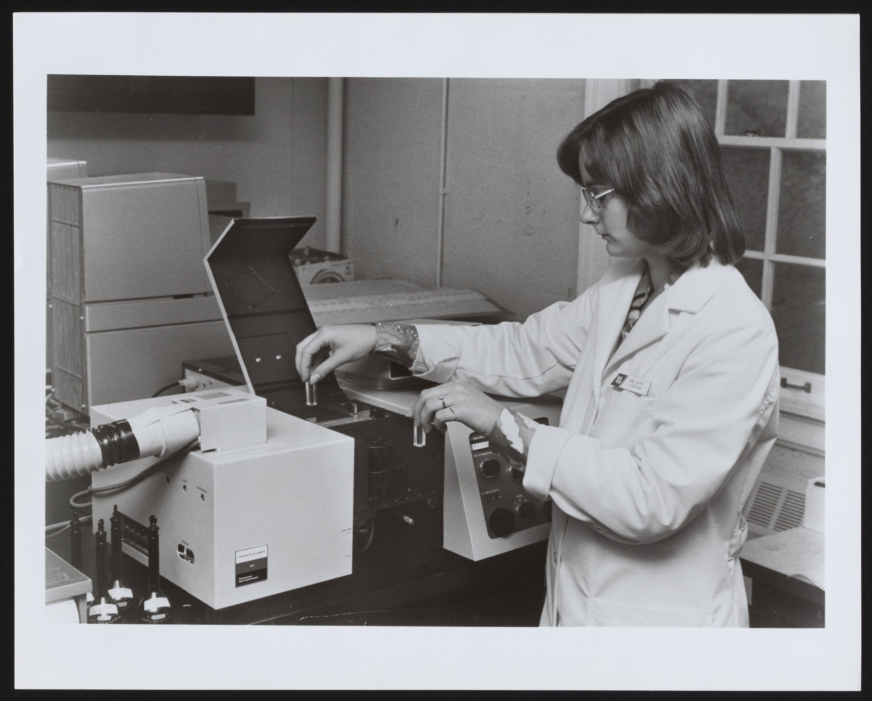 General view of chemist Janet Sheridan placing two oil samples into a Perkin-Elmer double-beam fluorescence spectrophotometer at a Coast Guard Research and Development Center laboratory. Per notations accompanying the photograph, the instrument is capable of analyzing two samples simultaneously and produces a single graph showing their identity and differences, aiding in the laboratory's work to track sources of oil spills.