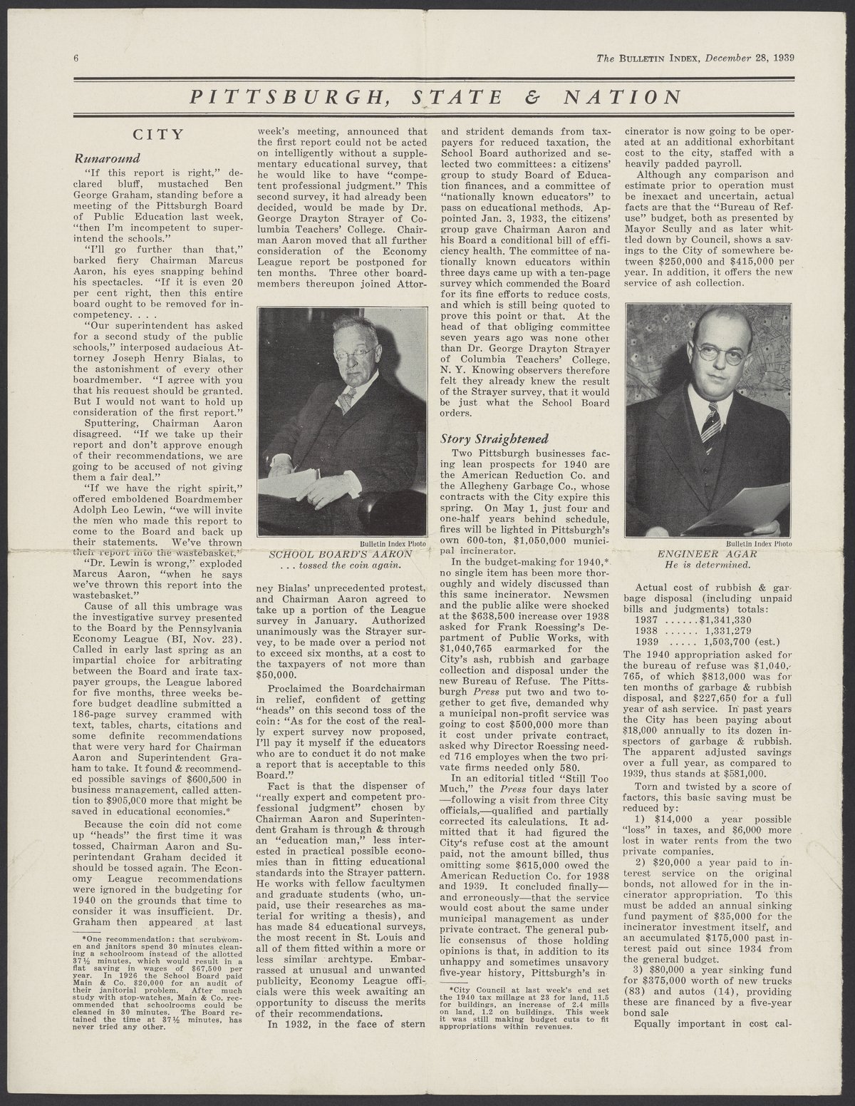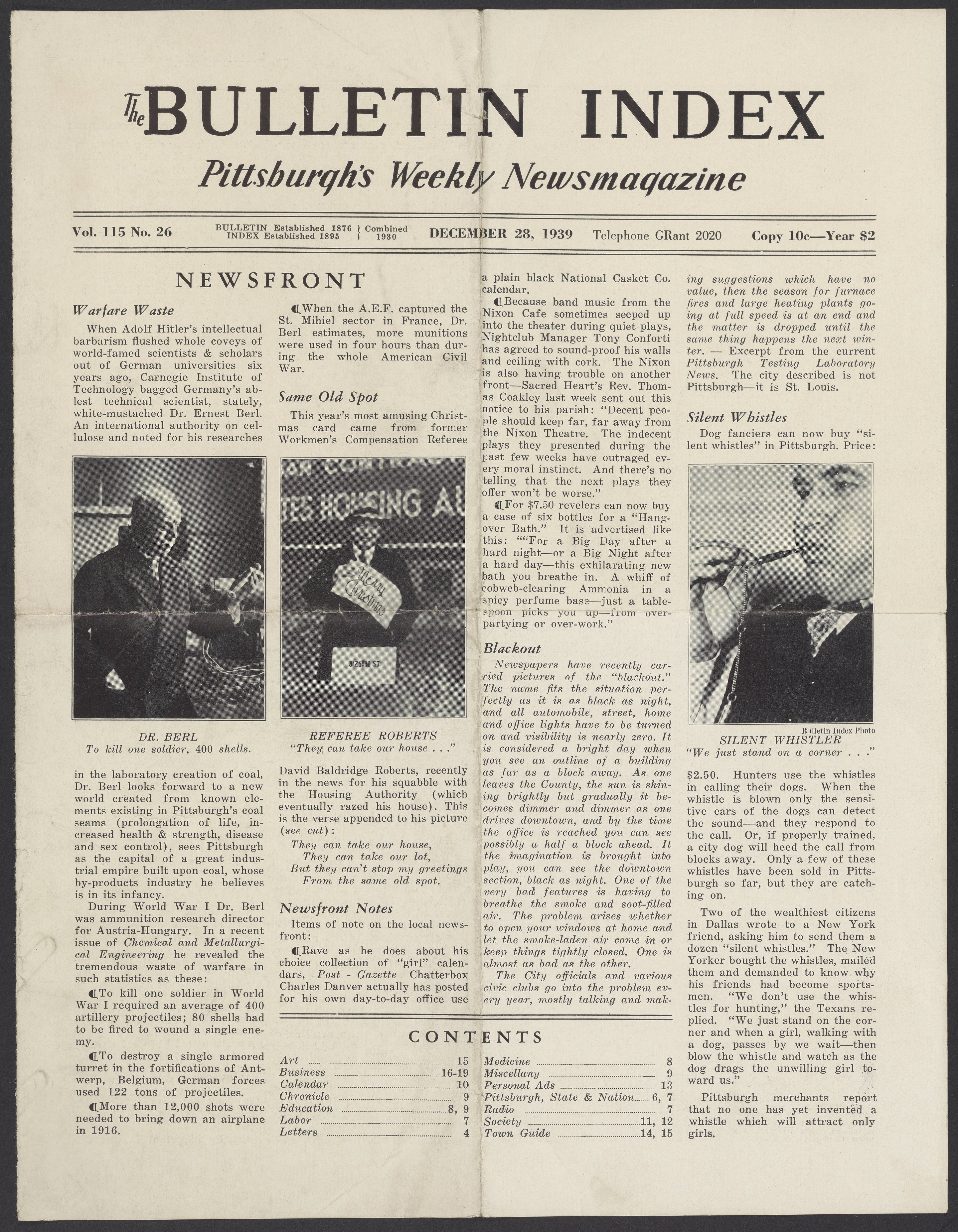 Front page and page 6 of the December 28, 1939 issue of the Bulletin Index: Pittsburgh's Weekly Newsmagazine. The article on the top left, titled "Warfare Waste," features Ernst Berl (1877-1946) discussing ammunition waste.