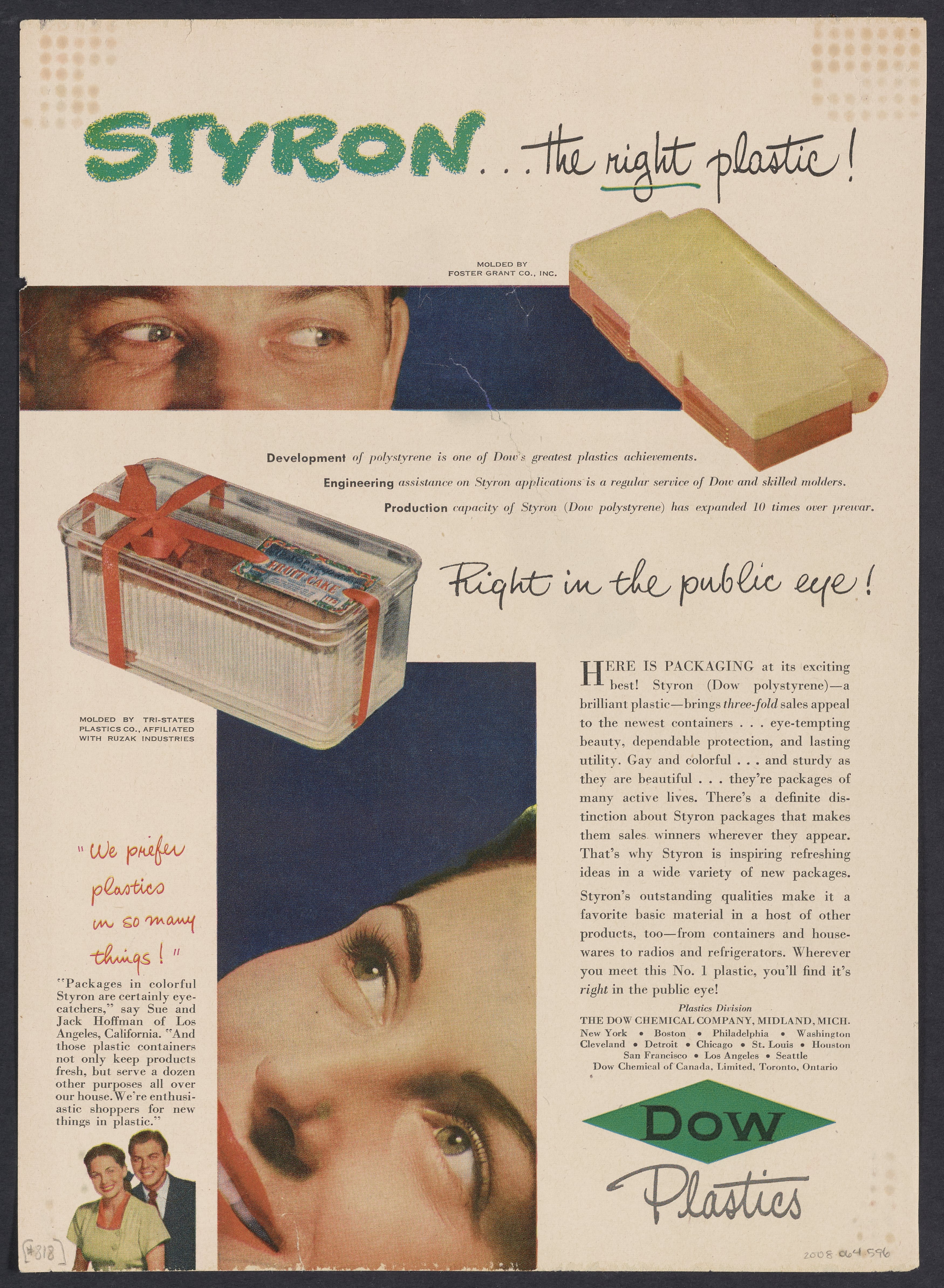 Dow Chemical Company. “Styron...The RIGHT Plastic! Right in the Public Eye!,” circa 1947. Advertisements from the Dow Chemical Historical Collection, Box 8. Science History Institute. Philadelphia. https://digital.sciencehistory.org/works/htsl31w.