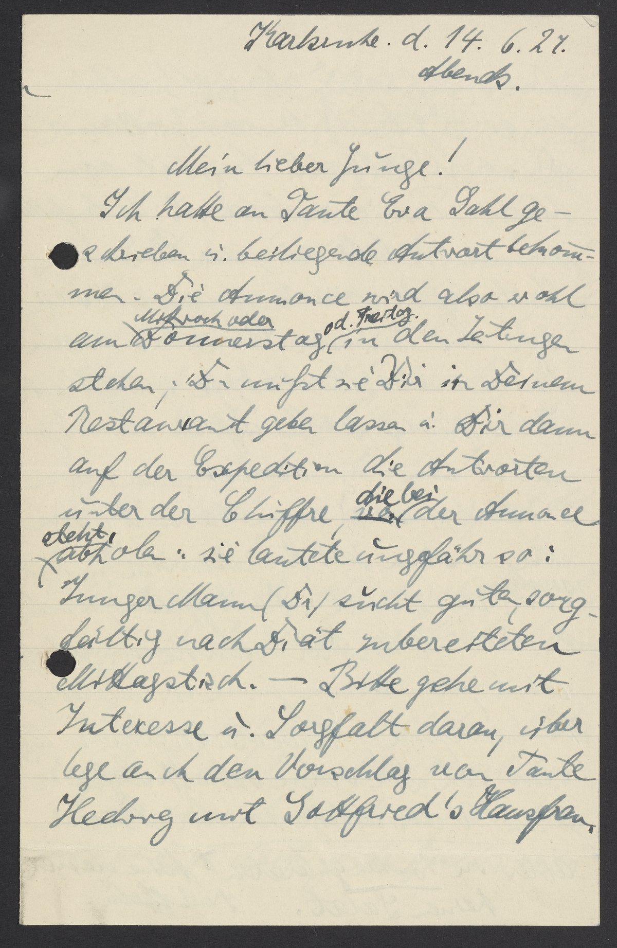 Ich hatte an Tante Eva Gahl geschrieben u. beiliegende Antwort bekommen. Die Annonce wird also wohl am Mittwoch oder Donnerstag oder Freitag in den Zeitungen stehen; Du mußt sie Dir in Deinem Restaurant geben lassen u. Dir dann auf der Expedition die Antworten unter der Chiffre, die bei der Annonce steht, abholen: sie lautete ungefähr so: Junger Mann, Du suchst guten, sorgfältig nach Diät zubereiteten Mittagstisch. – Bitte gehe mit Interesse u. Sorgfalt daran, überlege auch den Vorschlag von Tante Hedwig mit Gottfried’s Hausfrau.