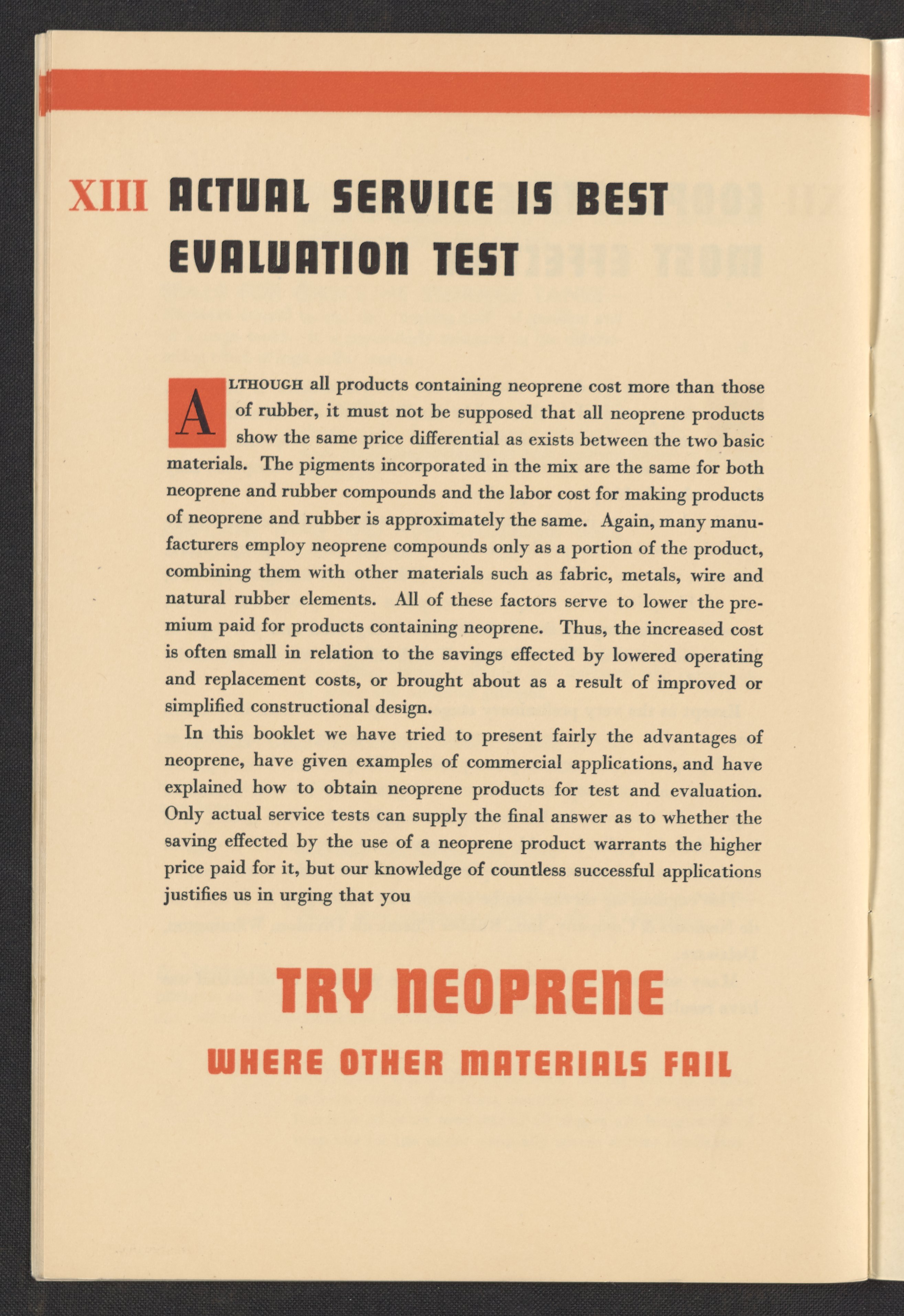 Small JPG1200 x 1743px — 396 KBFull-sized JPG2636 x 3829px — 1.8 MBOriginal fileTIFF — 2636 x 3829px — 28.9 MBPromotional booklet describing Neoprene, a rubber-like material made from polymerized chloroprene manufactured and sold by the E. I. du Pont de Nemours & Company. The publication describes the basic chemical and physical properties of the material, its potential uses, product varieties, and its desirable qualities for industrial applications. Includes an interleaved pamphlet titled A Short History of Neoprene: A Chemical Triumph, which provides a brief timeline of the substance's development, beginning in 1925 and ending with a note on future considerations.