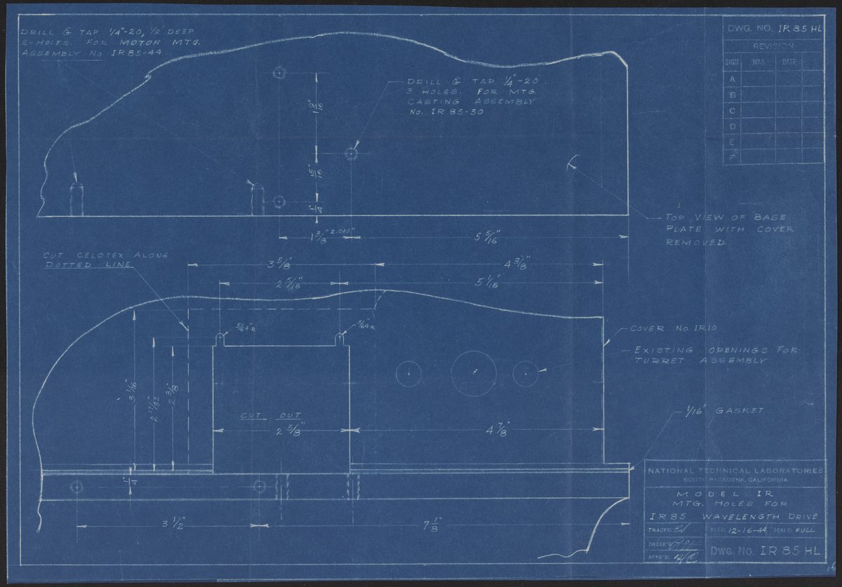 Beckman Instruments, Inc. “Mtg. Holes for Beckman IR-85 Spectrophotometer Wavelength Drive,” December 16, 1944. Beckman Historical Collection, Box 18, Folder 9. Science History Institute. Philadelphia. https://digital.sciencehistory.org/works/hx11xf24j.