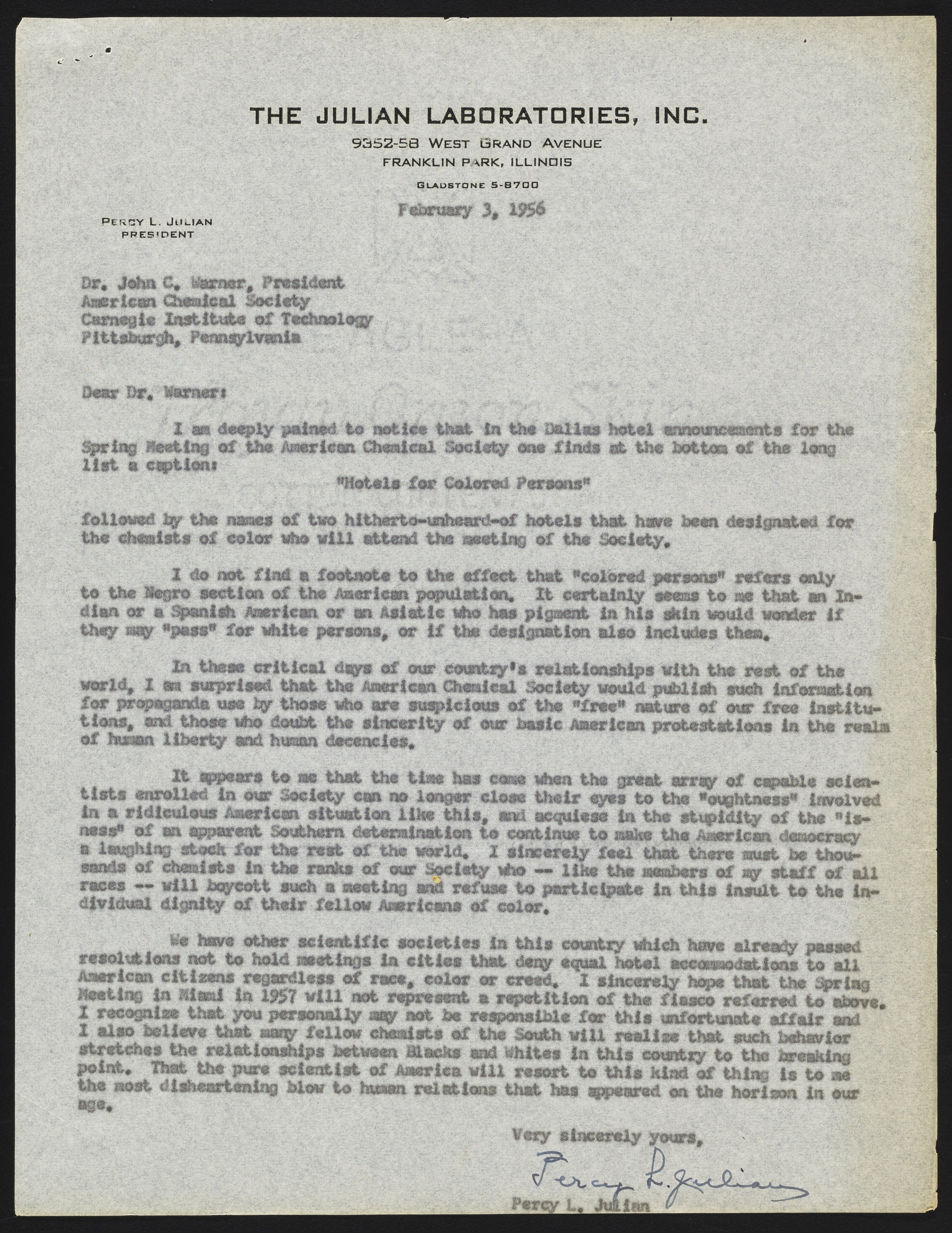 Letter from African American research chemist Percy L. Julian to American Chemical Society President John C. Warner. The letter concerns Julian's critique of the inclusion of a list of "Hotels for Colored Persons" in the announcement of the Spring meeting of the American Chemical Society in Dallas, TX. Julian continues at length about human liberty, human decency, and race relations in the American South.