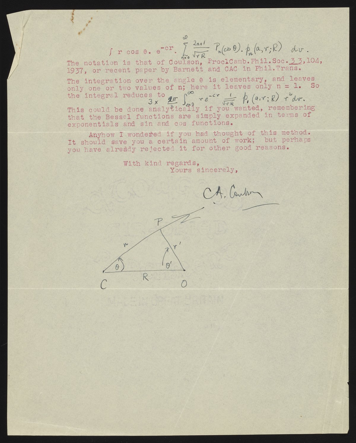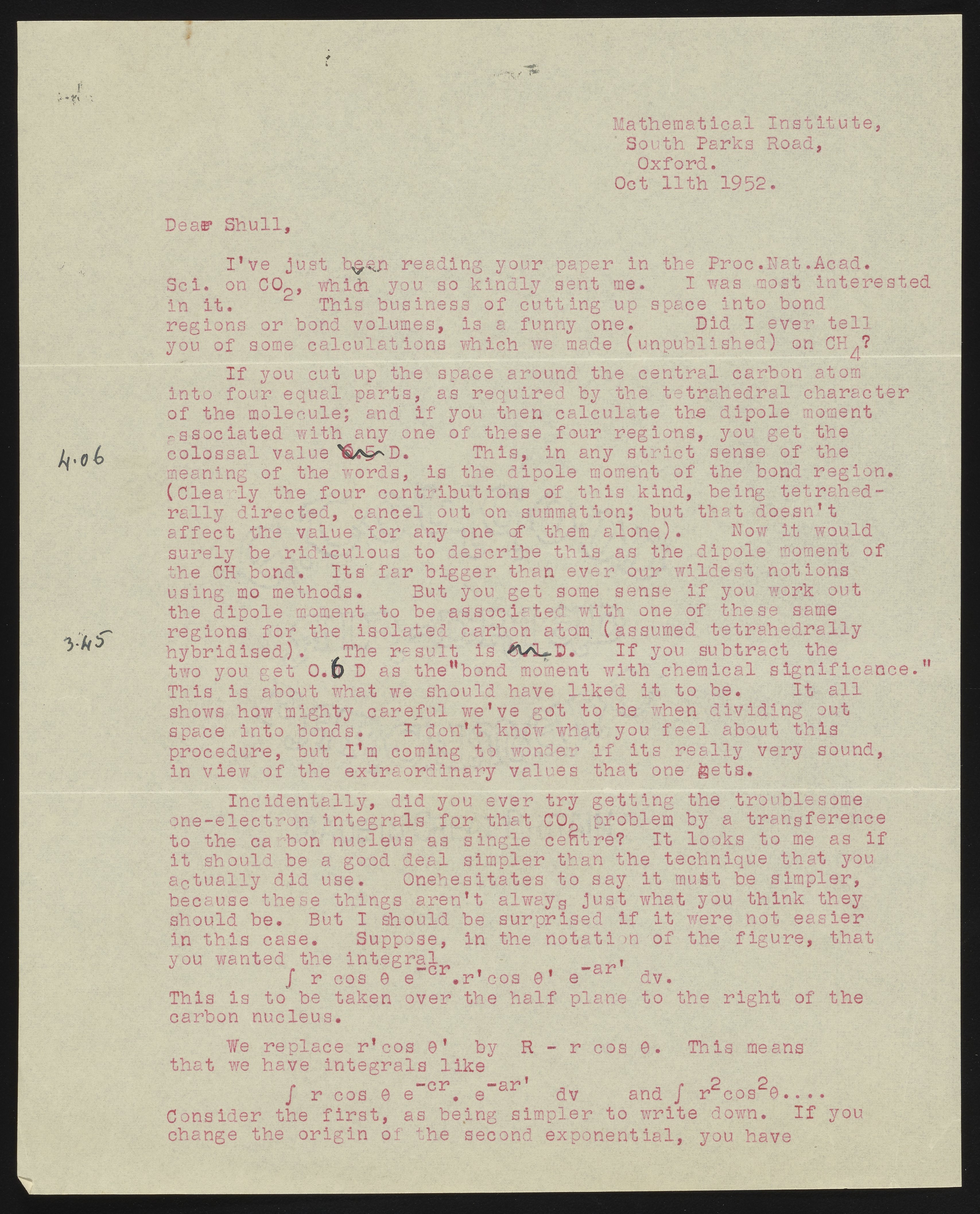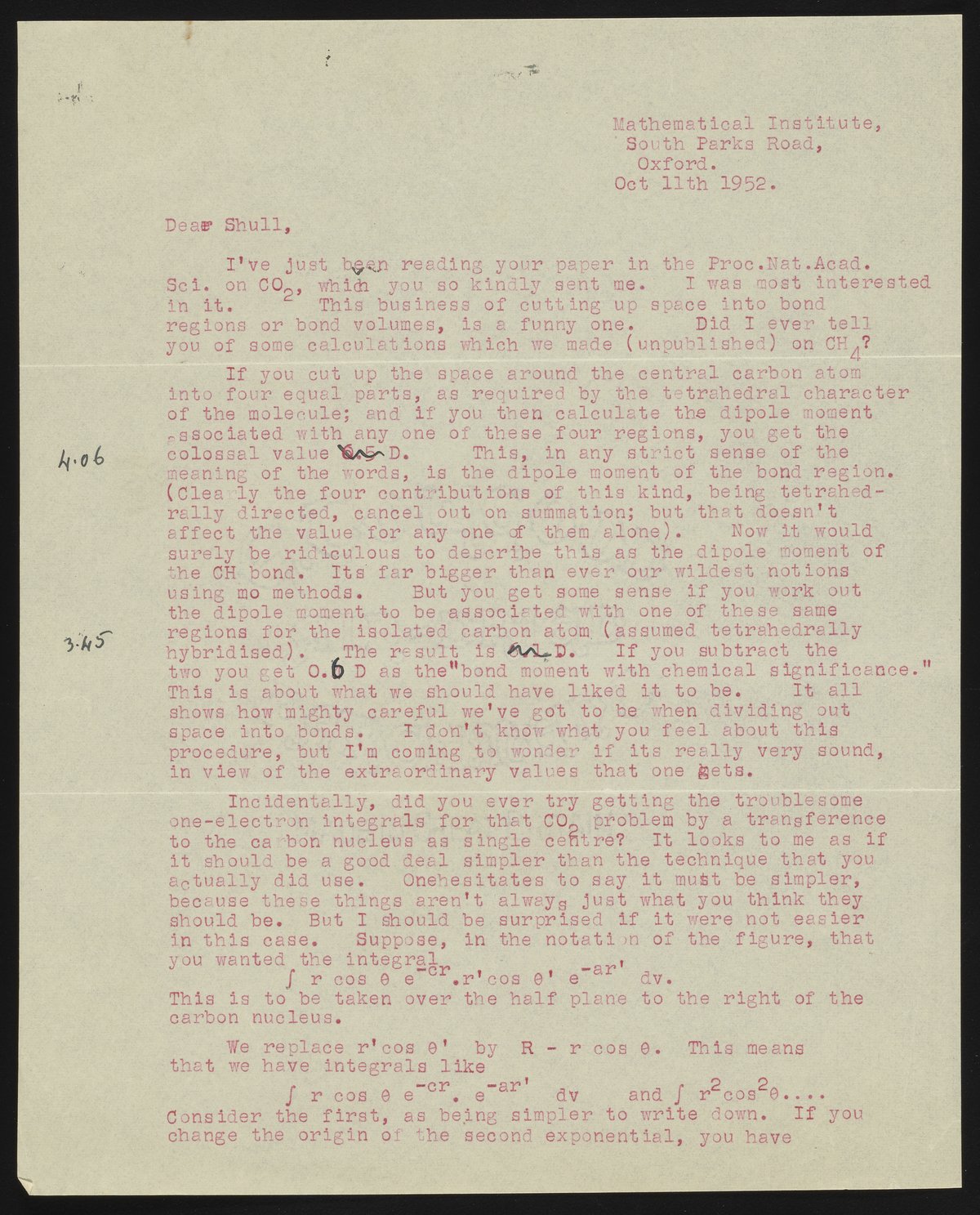 Letter from Charles Coulson to Harrison Shull, 1952