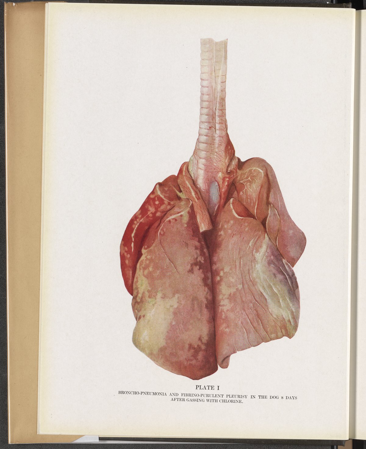 Winternitz, M. C. (Milton C.). “Plate I (Frontispiece): Broncho-Pneumonia and Fibrino-Purulent Pleurisy in a Dog 8 Days after Gassing with Chlorine.” Collected Studies on the Pathology of War Gas Poisoning. New Haven, Connecticut: Yale University Press, 1920. https://digital.sciencehistory.org/works/hx11xf43r.