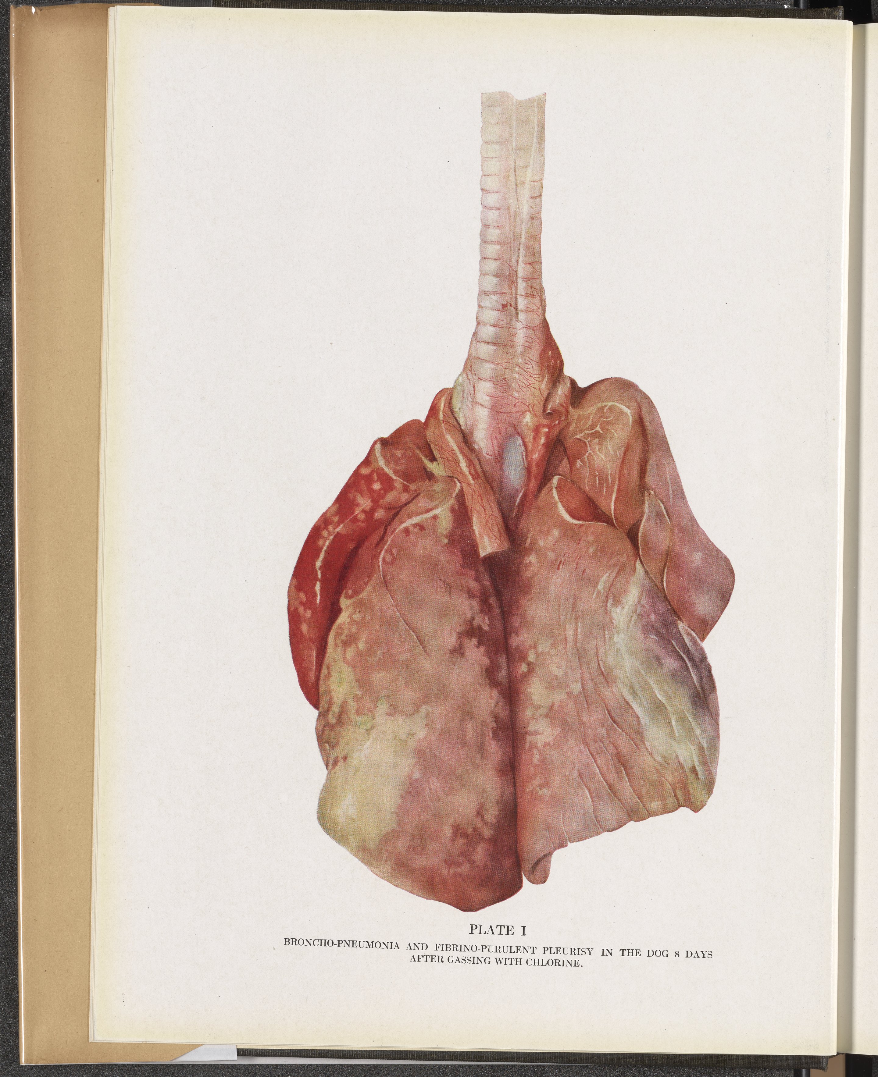 Winternitz, M. C. (Milton C.). “Plate I (Frontispiece): Broncho-Pneumonia and Fibrino-Purulent Pleurisy in a Dog 8 Days after Gassing with Chlorine.” Collected Studies on the Pathology of War Gas Poisoning. New Haven, Connecticut: Yale University Press, 1920. https://digital.sciencehistory.org/works/hx11xf43r.
