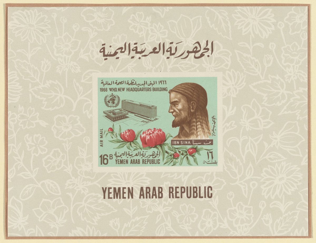 Stamp issued by the Yemen Arab Republic depicting Persian polymath Avicenna (circa 980 - 1037), also known as Ibn Sina, Abu Ali Sina, and Pur Sina, as well as red roses and the new World Health Organization headquarters in Geneva completed in 1966. Avicenna is regarded as one of the most significant physicians, astronomers, and writers of the Islamic Golden Age, as well as the father of modern medicine.
