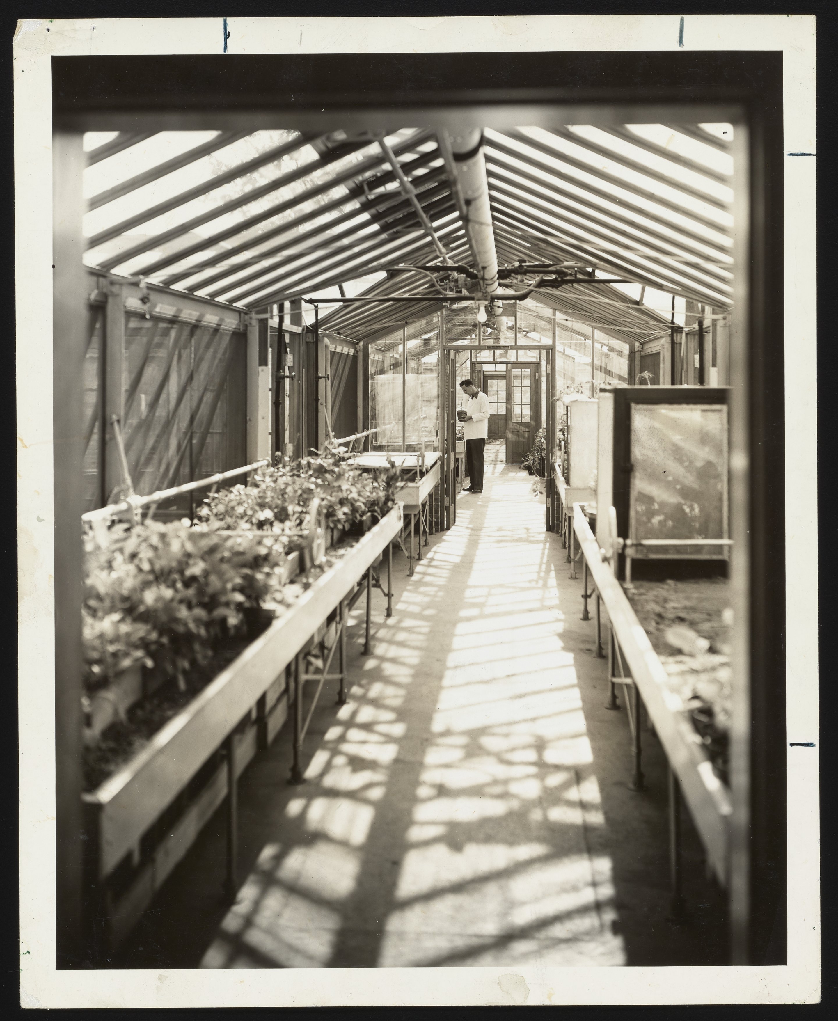 Dow Chemical Company. “Greenhouse at Dow Agricultural Chemical Research Laboratory,” August 1941. Dow Chemical Company Historical Image Collection, Box 2, Folder Plants--Agricultural Research & Development Greenhouse. Science History Institute. Philadelphia. https://digital.sciencehistory.org/works/hx11xg27k.