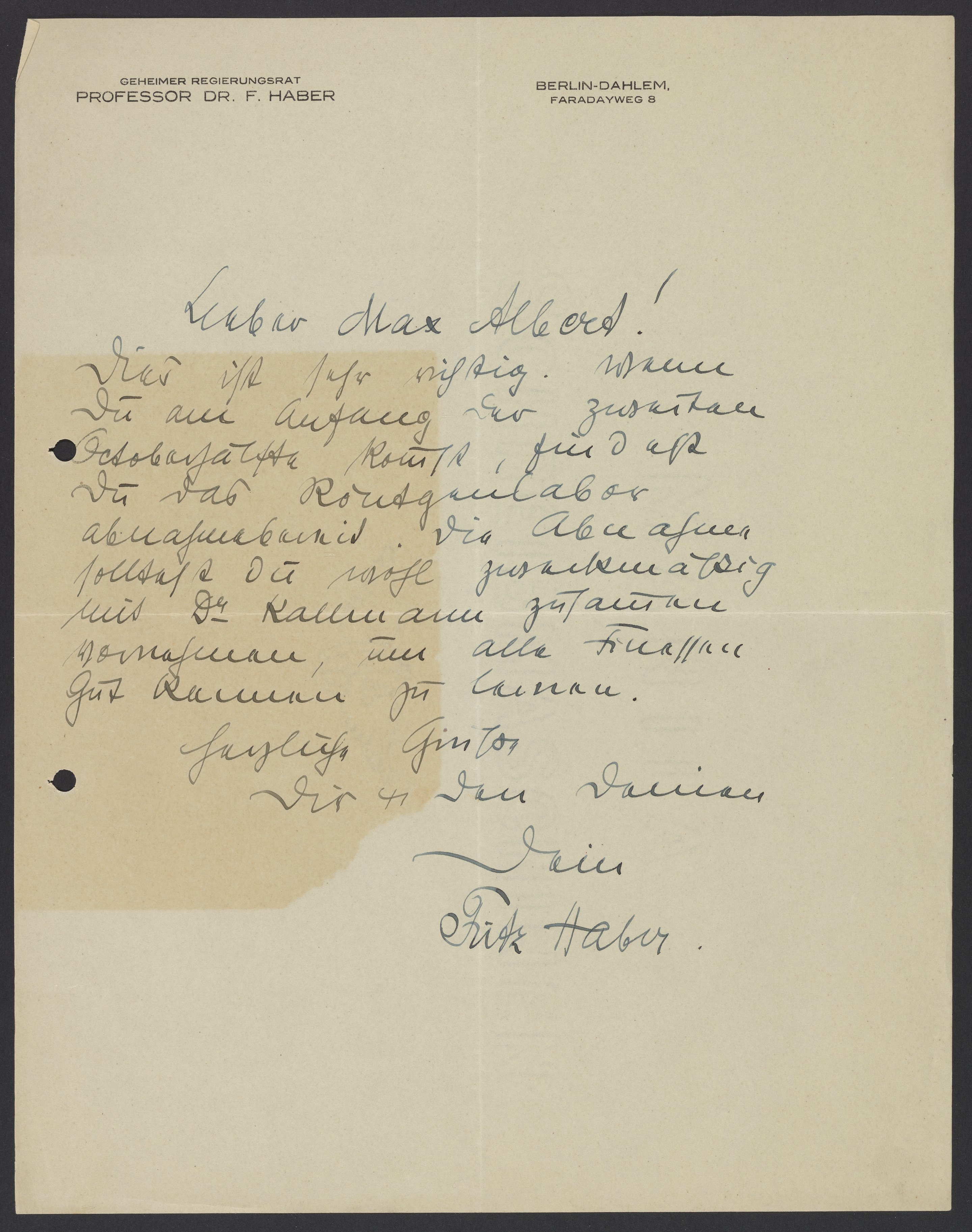 Fritz Haber (1868-1928), a German chemist who won the Nobel Prize in Chemistry in 1918 for his invention of the Haber–Bosch process, informs Max Bredig (1902-1977) that the X-ray laboratory will be ready when he arrives in Berlin to work at Haber's Kaiser Wilhelm Institute for Physical Chemistry and Electrochemistry as an assistant scientist.