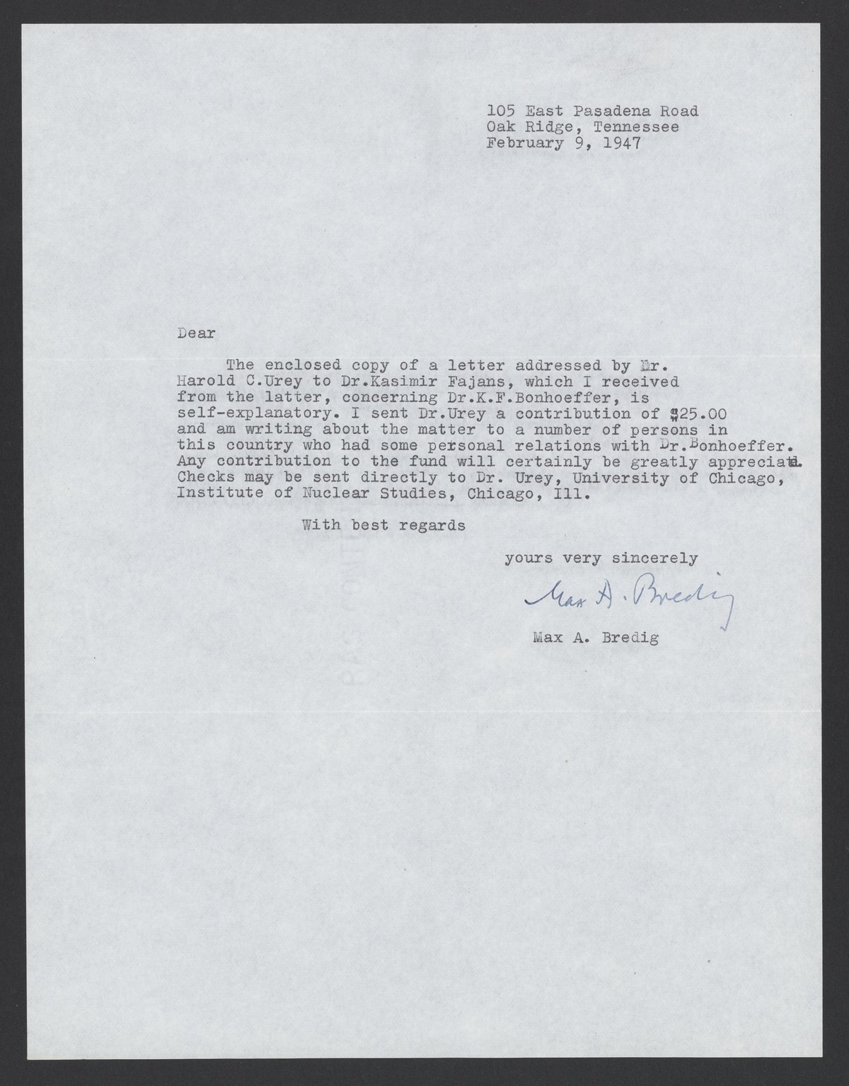 Letter from Max A. Bredig, February 9, 1947
