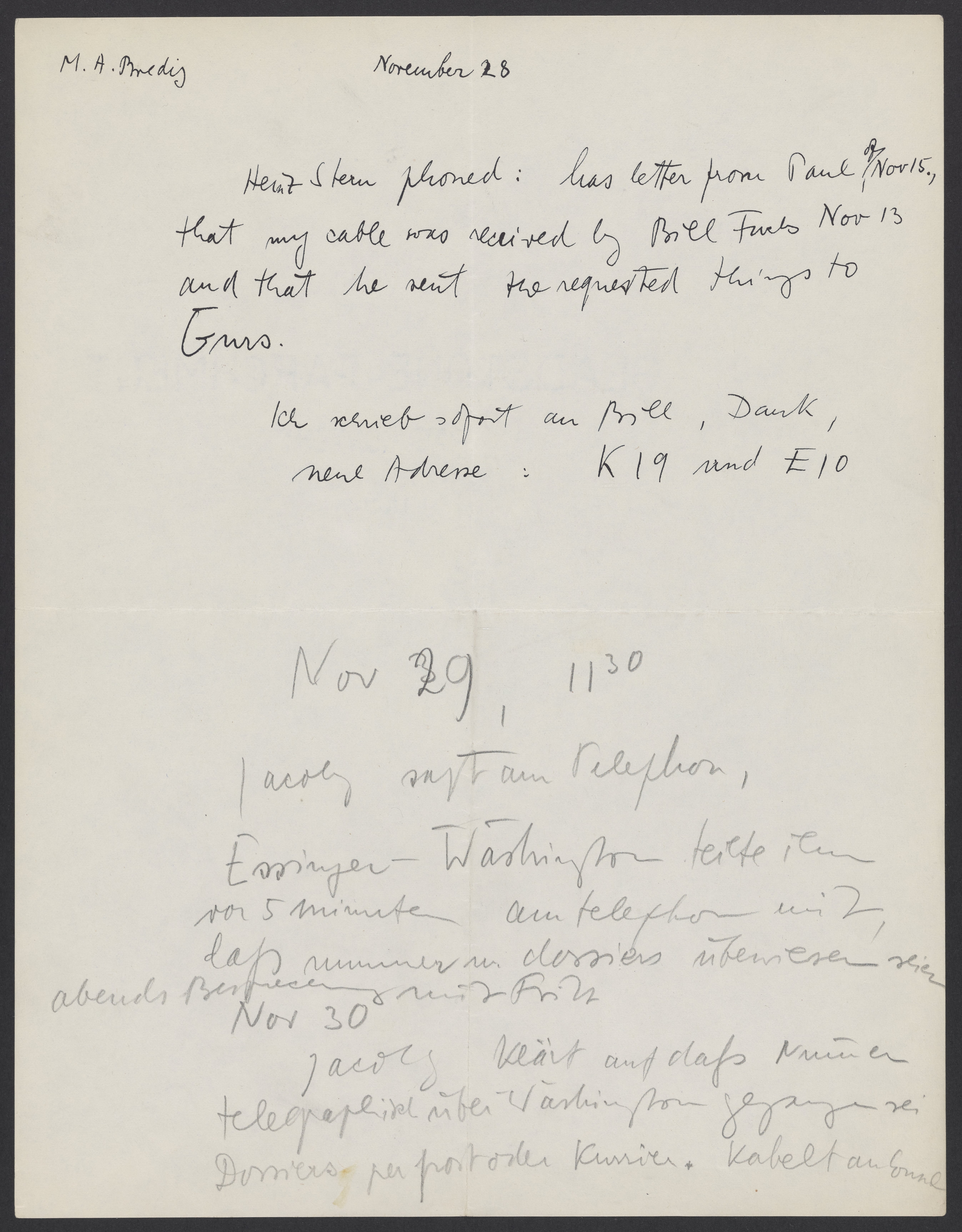 Max Bredig (1902-1977) takes notes on recent events; Paul Stern received correspondence from Paul Homburger (1882-1965), Bill Fuchs received Bredig's cable, and Stern mailed items to Bredig's sister who is interned at the Gurs concentration camp in Gurs, France.