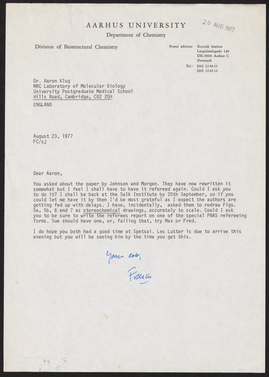 Crick, Francis. “Letter from Francis Crick to Aaron Klug, August 23, 1977,” August 23, 1977. History of Molecular Biology Collection, Box 20, Folder 1. Science History Institute. Philadelphia. https://digital.sciencehistory.org/works/i0taplx.