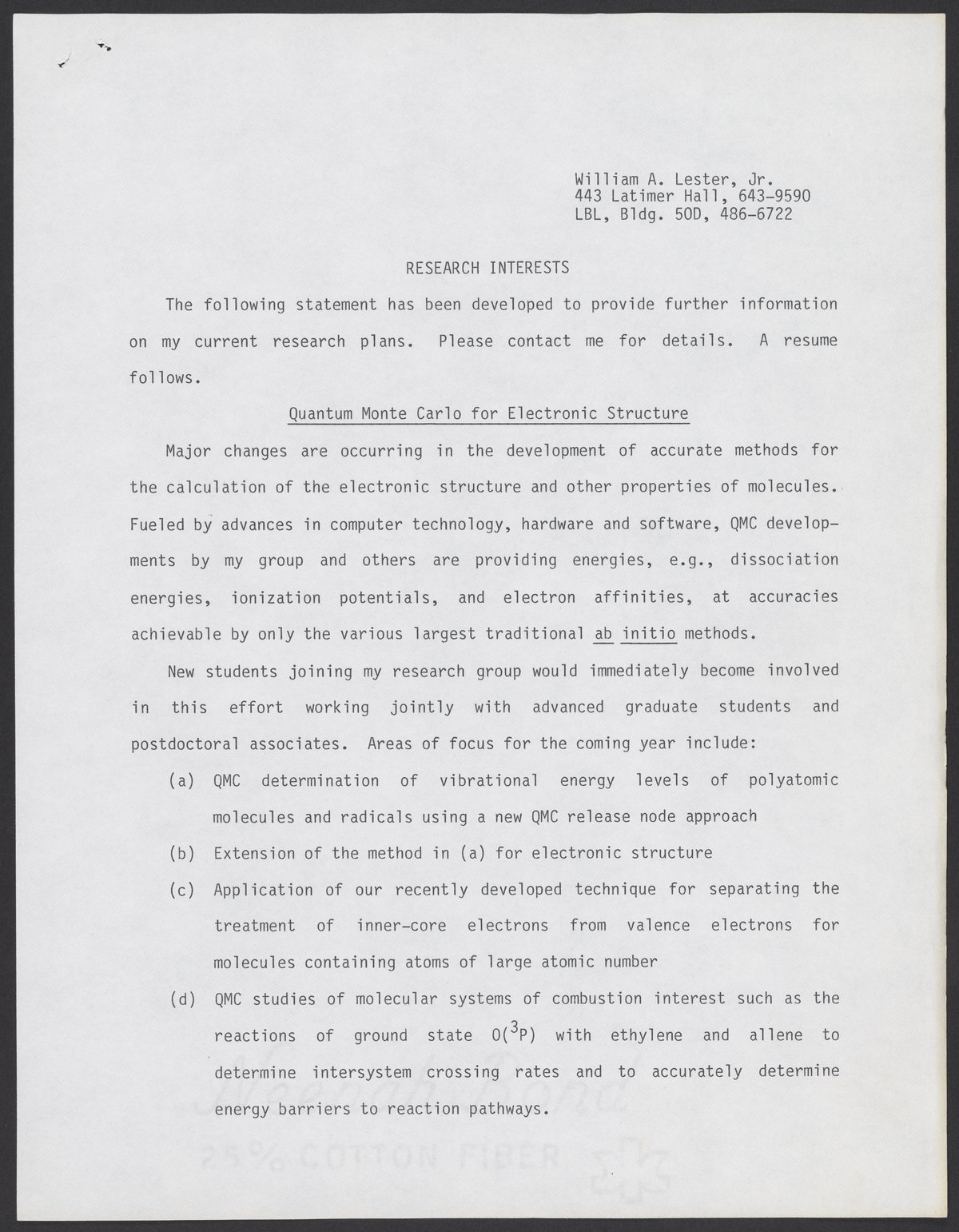 Document with biography and research interests of William A. Lester, Jr. (1937-).