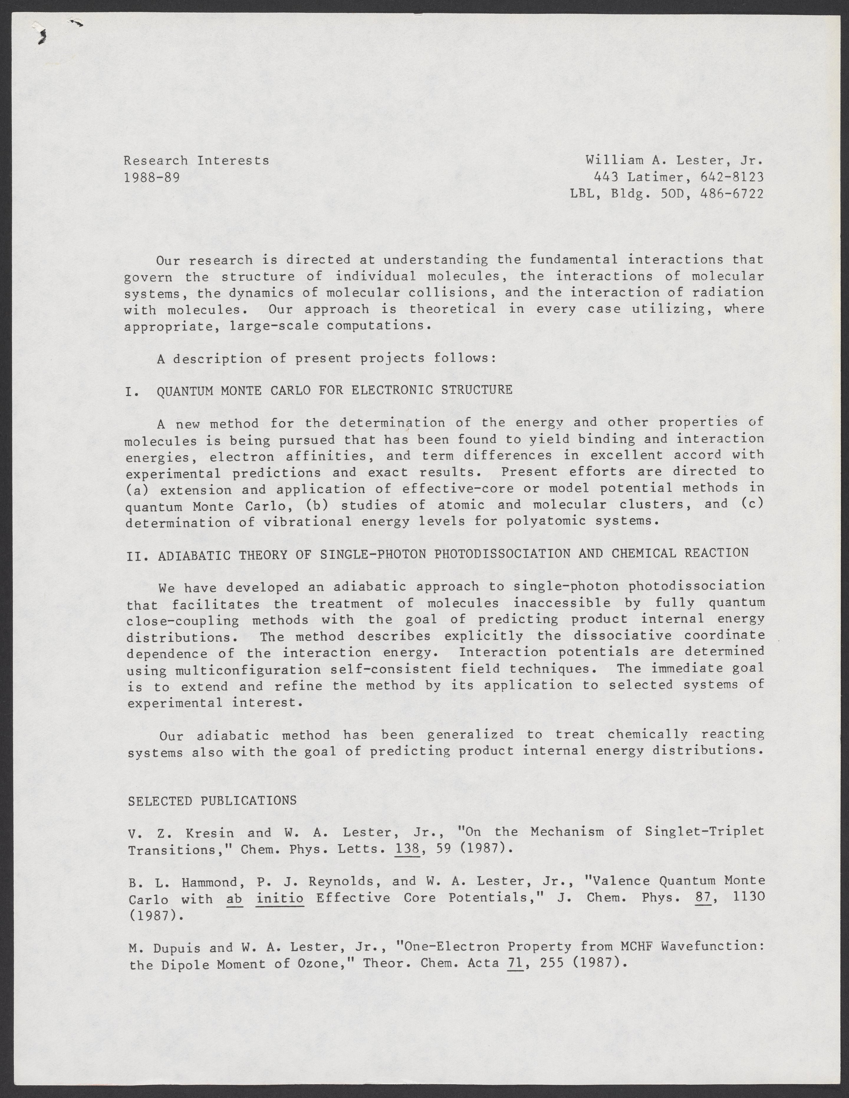 Lester, William A., Jr. “Biography of William A. Lester, Jr., 1988,” July 14, 1988. William A. Lester, Jr. Papers, Box 33, Folder 22. Science History Institute. Philadelphia. https://digital.sciencehistory.org/works/i1iwjyp.
