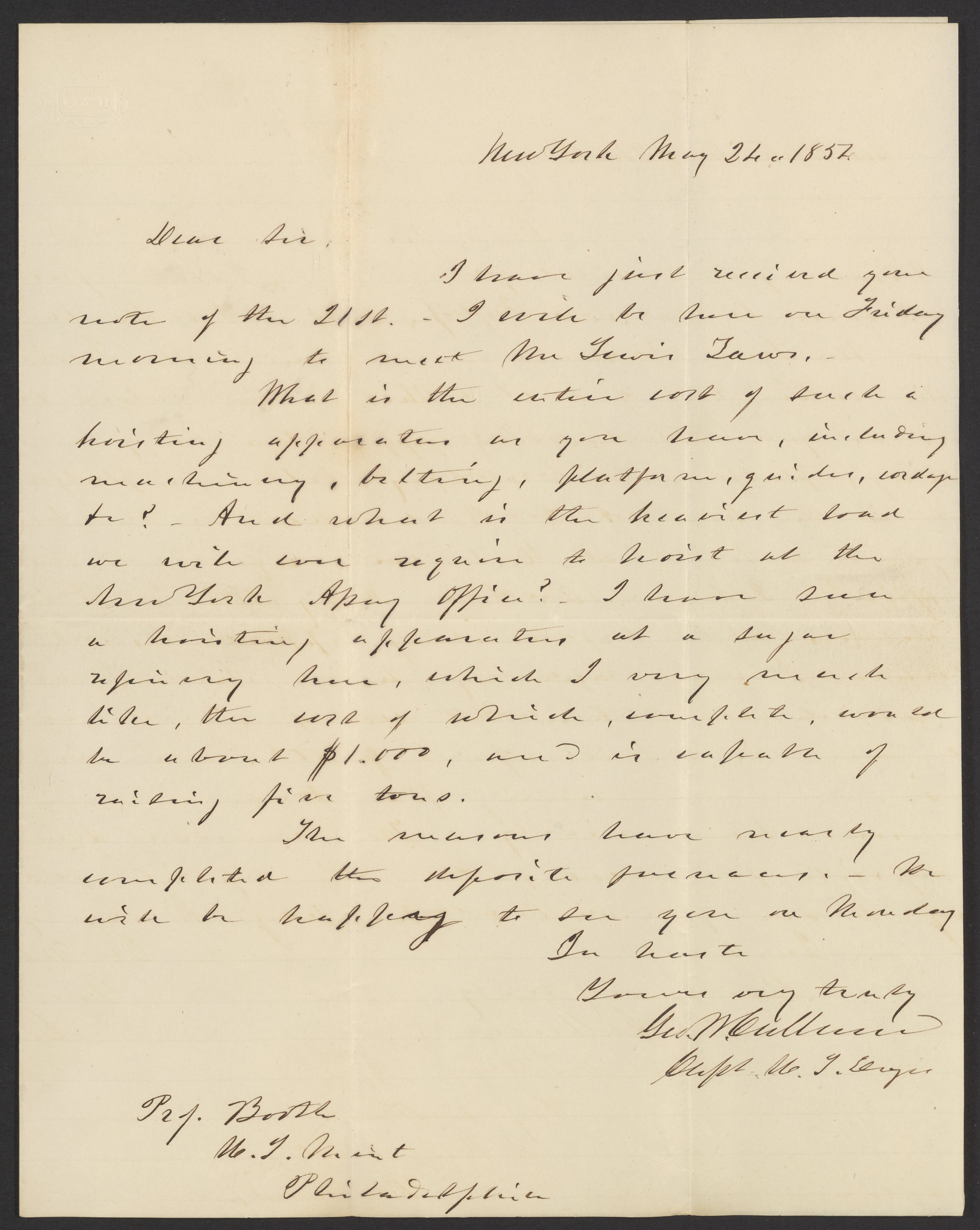 Letter from G.W. Cullom to James Curtis Booth, May 24, 1854