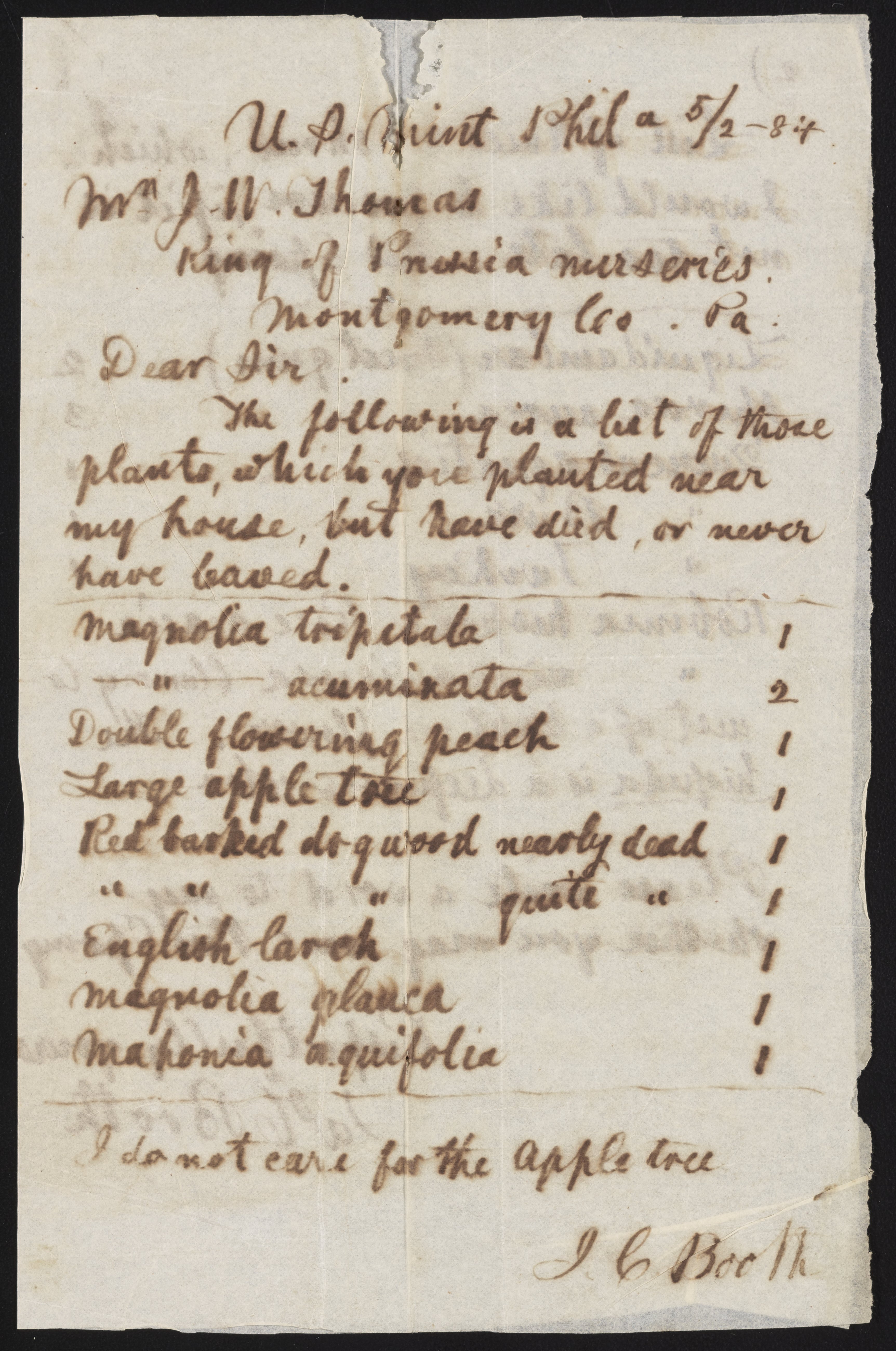 Letter from James Curtis Booth to J.W. Thomas, May 2, 1884