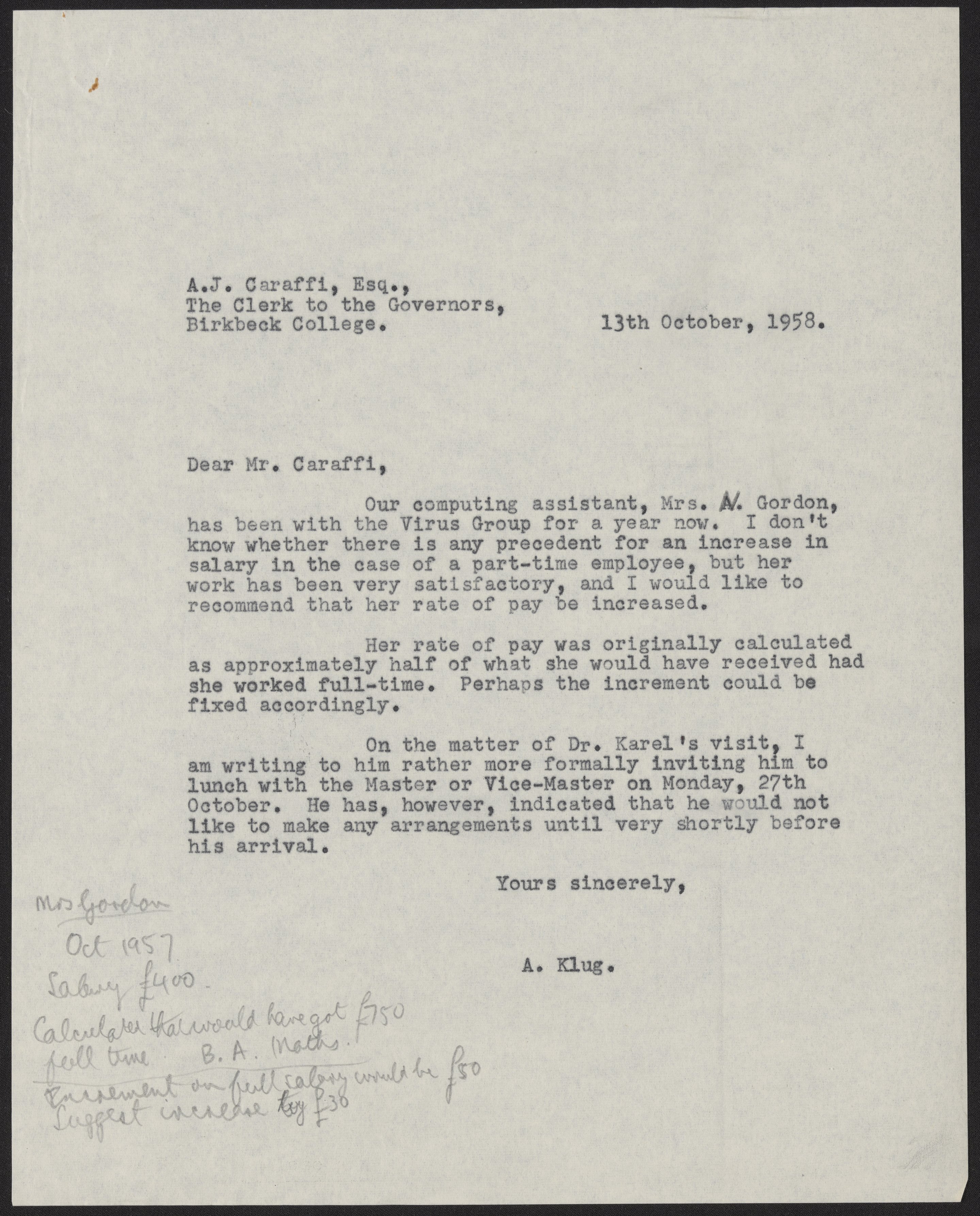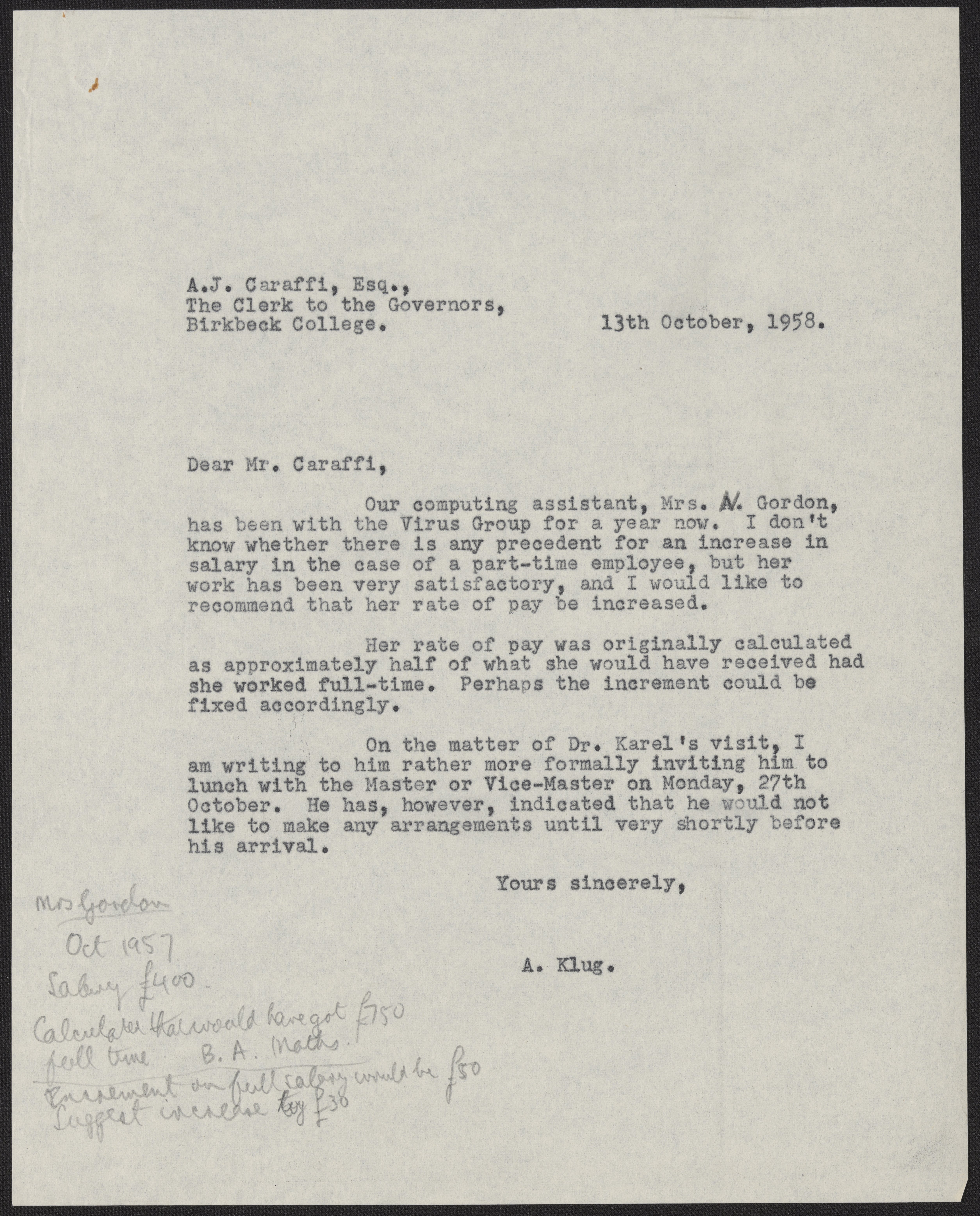 Letter from A. J. Caraffi to Aaron Klug, October 13, 1958