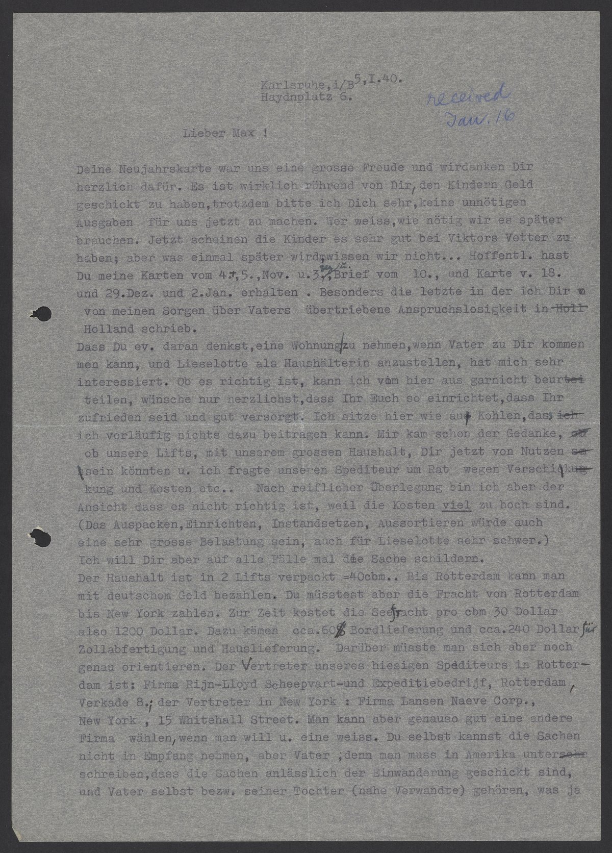 Small JPG1200 x 1672px — 470 KBLarge JPG2880 x 4014px — 3.2 MBFull-sized JPG5242 x 7306px — 9.6 MBOriginal fileTIFF — 5242 x 7306px — 110 MBIn a letter to her brother, Max Bredig (1902-1977), Marianne Homburger (1903-1987) discusses the costs of shipping household belongings from Germany to New York.