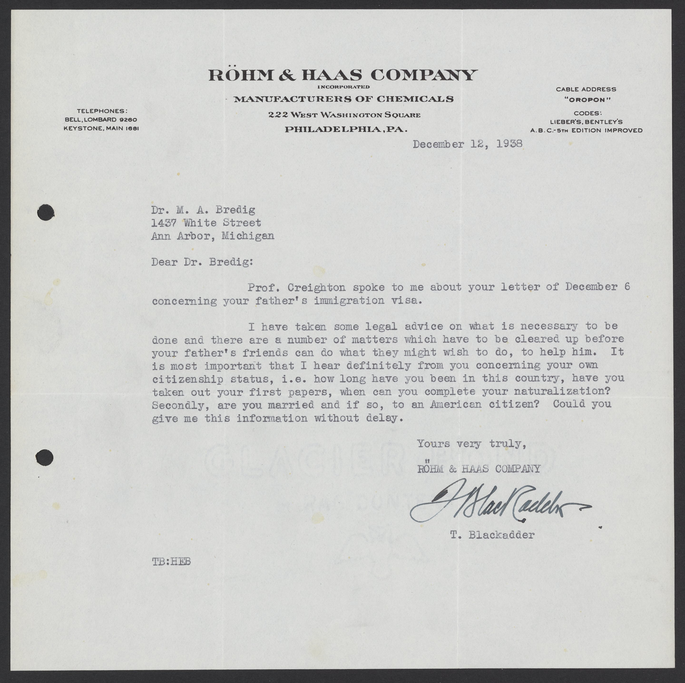 Thomas Blackadder (1887-1953) gives Max Albert Bredig (1902-1977) advice on how to bring his father, Georg Bredig (1868-1944), to the United States.