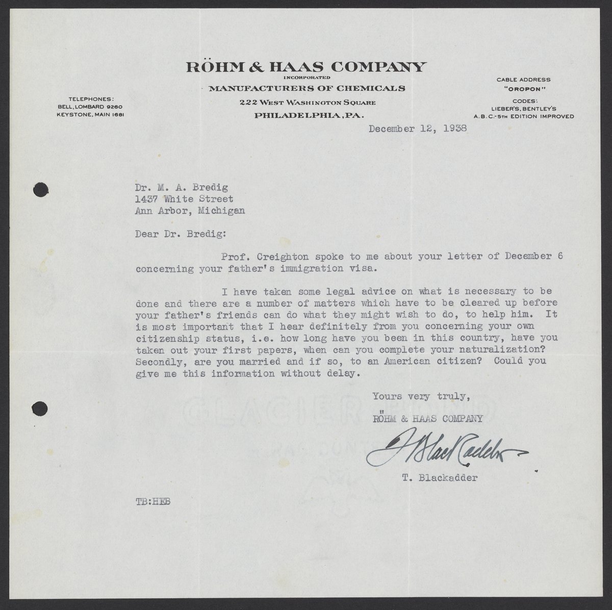 Letter from Thomas Blackadder to Max Bredig, December 1938