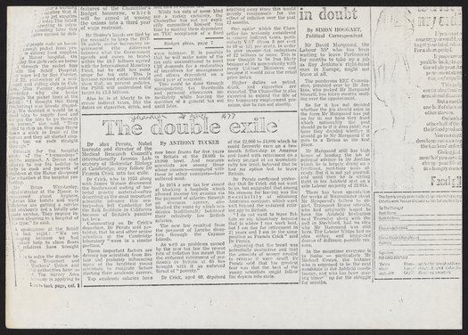 Tucker, Anthony. “The Double Exile,” March 28, 1977. History of Molecular Biology Collection, Box 19, Folder 26. Science History Institute. Philadelphia. https://digital.sciencehistory.org/works/ia7q5oi.