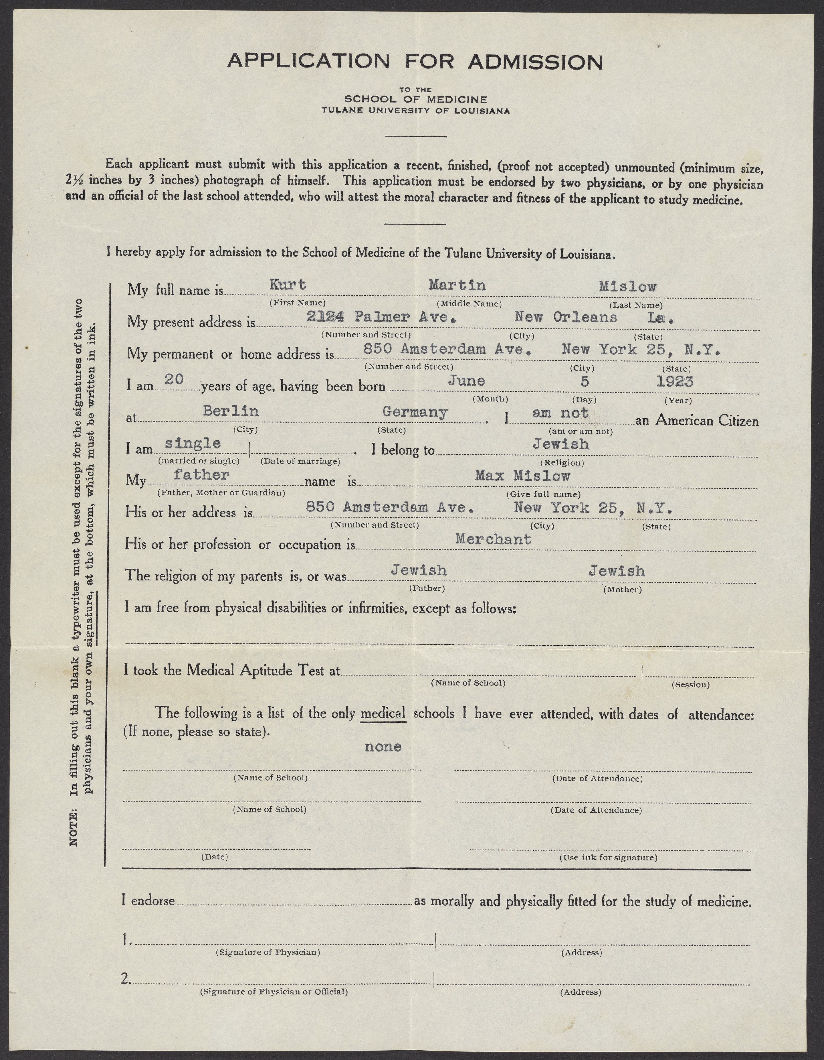 Kurt M. Mislow's (1923-2017) application for admission to the School of Medicine at Tulane University. The application has information about Mislow's current address as well as his father's address and profession.