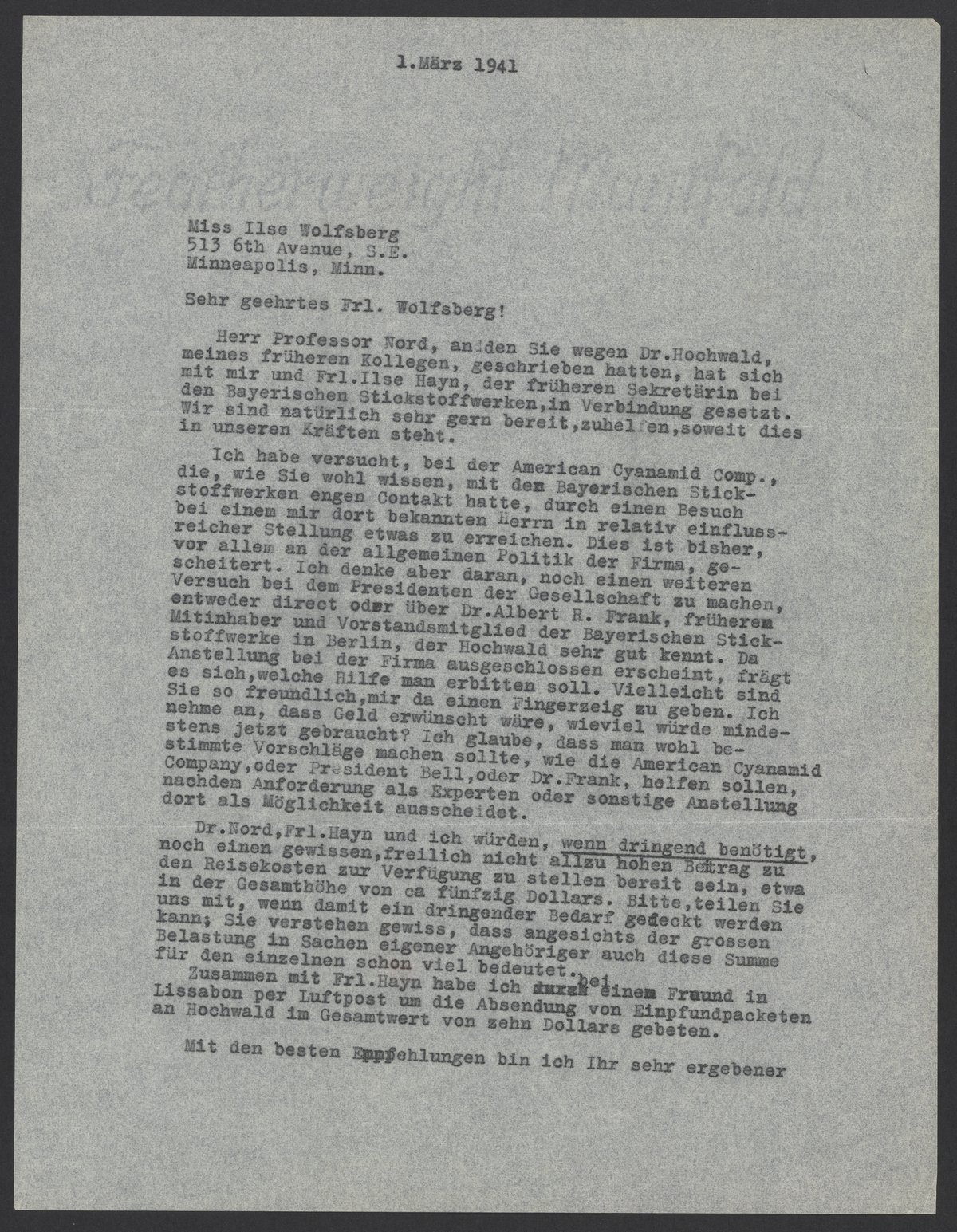 I tried to arrange something with the American Cyanamid Comp by visiting a gentleman I know in a relatively influential position. As you probably know, this company had close ties with the Bavarian Nitrogen Works. I haven’t been successful so far because of the company’s political stance. However, I am considering contacting the company’s president, either directly or through Dr. Albert R. Frank. He is the former co-owner and a board member of the Bavarian Nitrogen Works in Berlin and knows Hochwald very well. Since employment at the company seems impossible, the question arises as to what kind of assistance we should seek. Perhaps you would be so kind as to give me a hint. I assume that money would be suitable. How much would be needed now? I think we could suggest how the American Cyanamid Company, President Bell, Dr. Frank, should help, especially since Hochwald’s service as an expert or other employment options there are no longer possible.