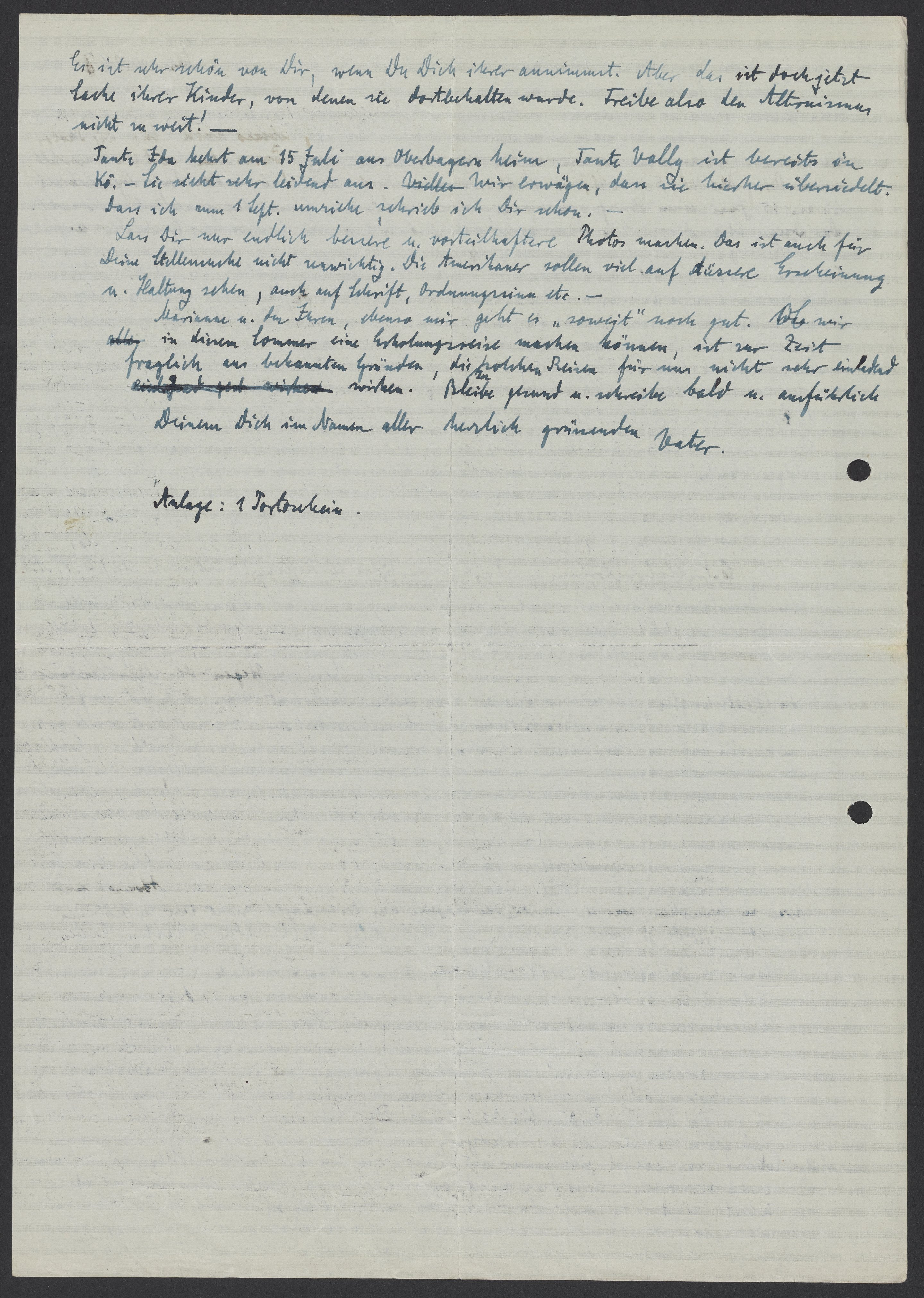 Tante Ida kehrt am 15 Juli aus Oberbayern heim, Tante Vally ist bereits in Kö. Sie sieht sehr leidend aus. Wir erwägen, dass sie hierher übersiedelt. Dass ich zum 1. Sept umziehe, schrieb ich Dir schon.